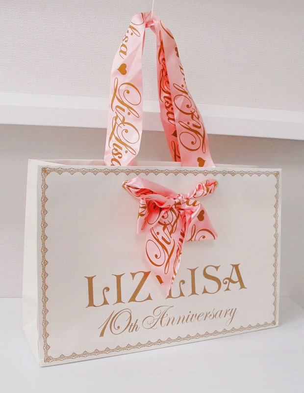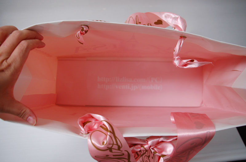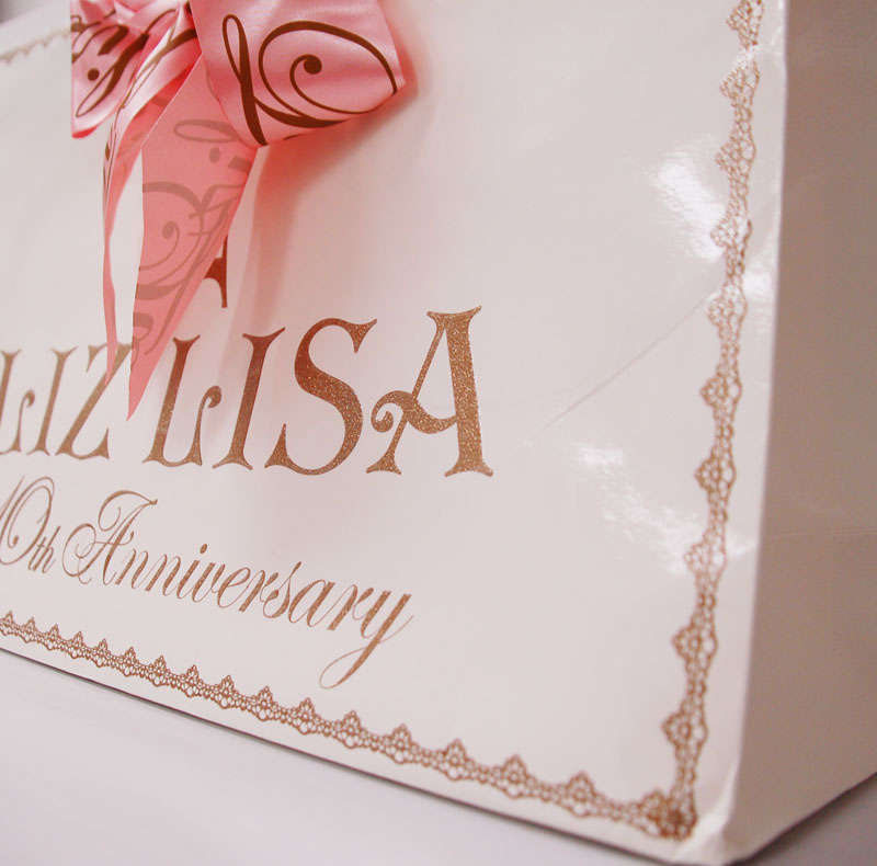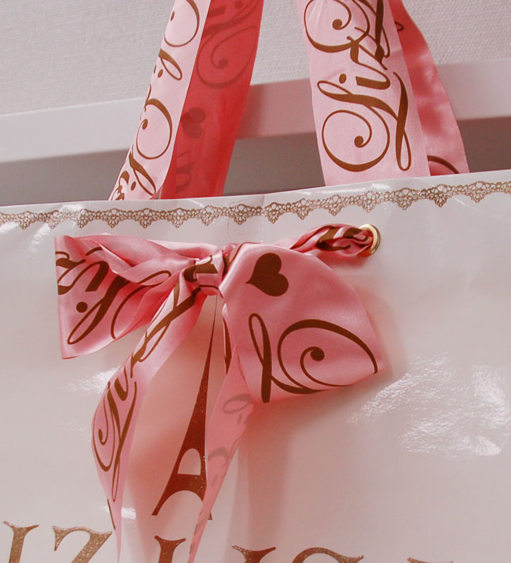 大きなリボン!フェミニンなショップ袋2012年10月30日 こんばんは、ベリービー辻です。 今日はフェミニンなショップ袋のご紹介です。 10周年記念ショップ袋です。 見てください!このリボン! 巾50mmもあるんです。 ブランドロゴを印刷しています。 ゴールドで印刷した上から ラメをしいています。 内面はベビーピンクで フェミニン度アップ! 毎日ショップ袋を見ていますが ここまで巾の広いリボンは初めてです。 フェミニンに振り切った素敵な ショップ袋です。