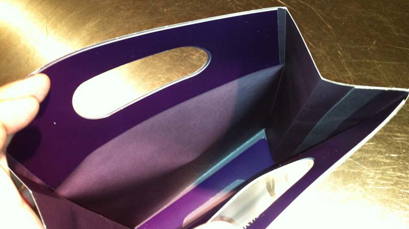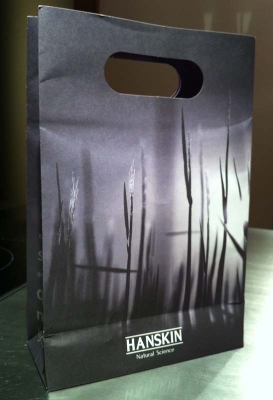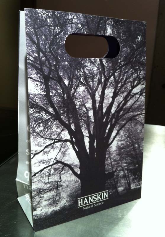 クールなデザインの紙袋印刷2011年05月08日 こんにちはベリービー商品開発のウエキです。 今日はアジア自然は化粧品で有名な 「HANSKI」の手提げ袋をご紹介します。 手提げ紐の無いシンプルな手提げ袋です。 用紙はエコをイメージした再生紙を使用しています。 表面にPPなどの加工がないところが 紙袋のナチュラル感を強調しています。 何より表面に印刷された モノトーンの風景写真がカッコイイですね。 大人のオーガニックを感じさせます。 中も手抜きが無く、 シックな紫色の紙袋印刷がなされています。 ニューヨークって感じのデザインですね。