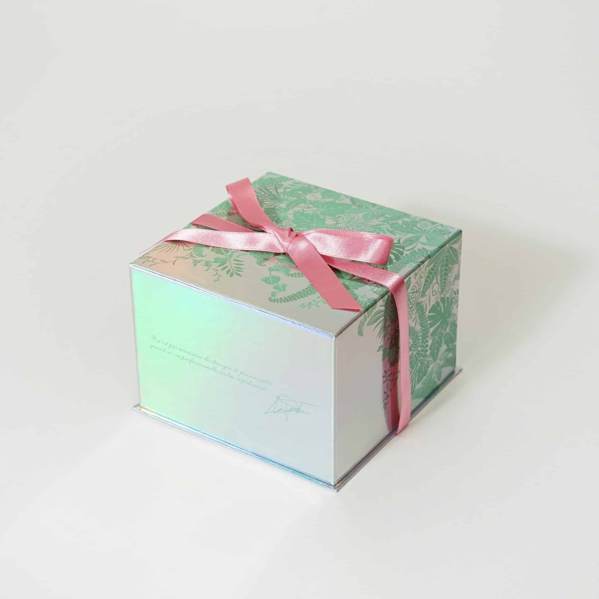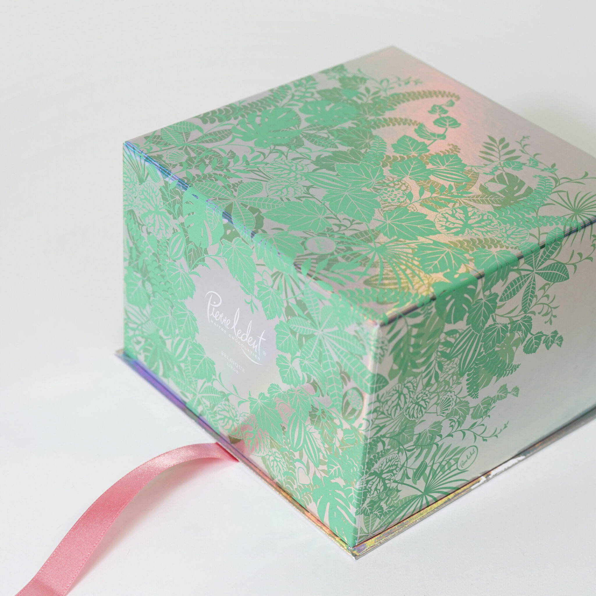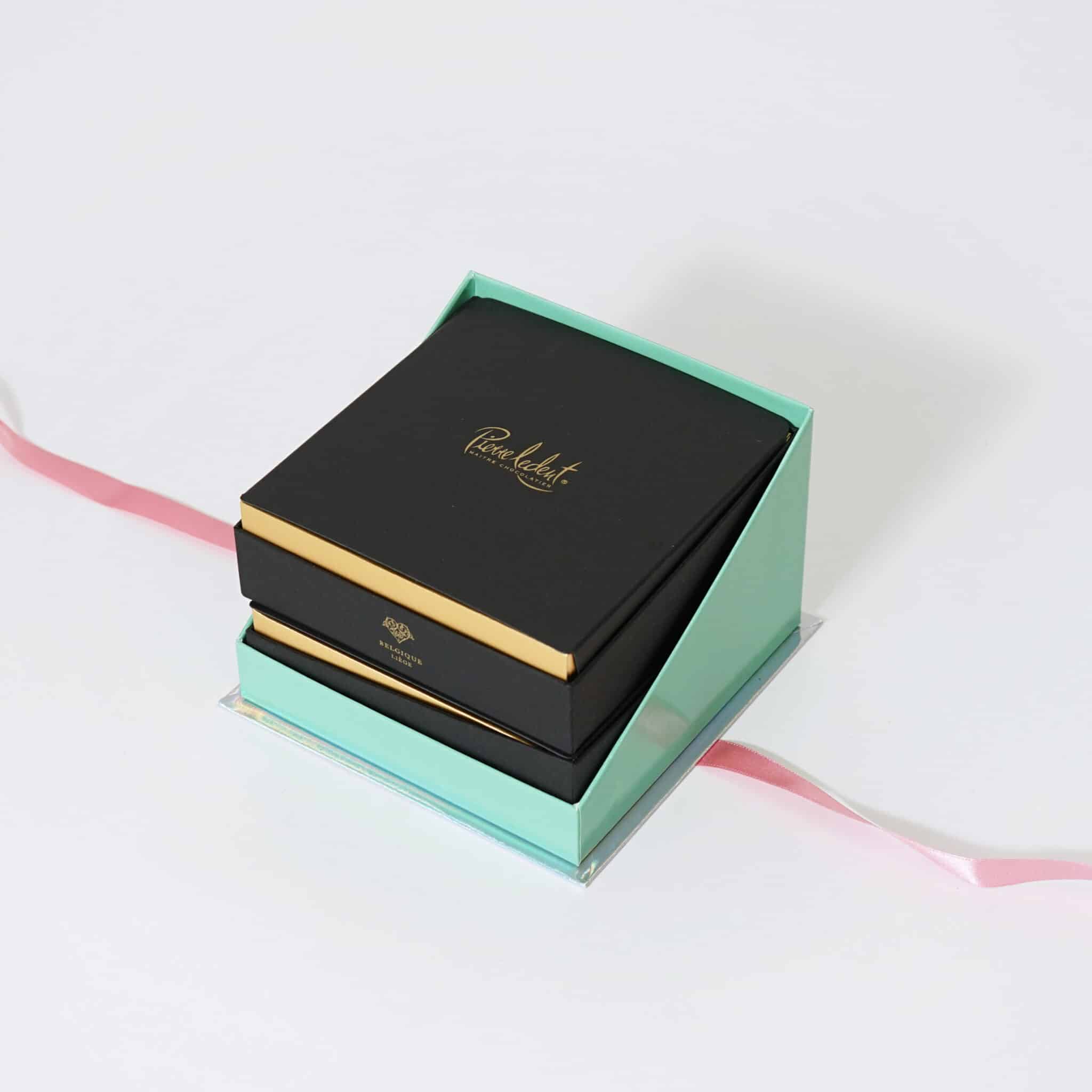 透明感のあるアイスグリーンの身箱に、ショコラボックスが二つ収まっています。