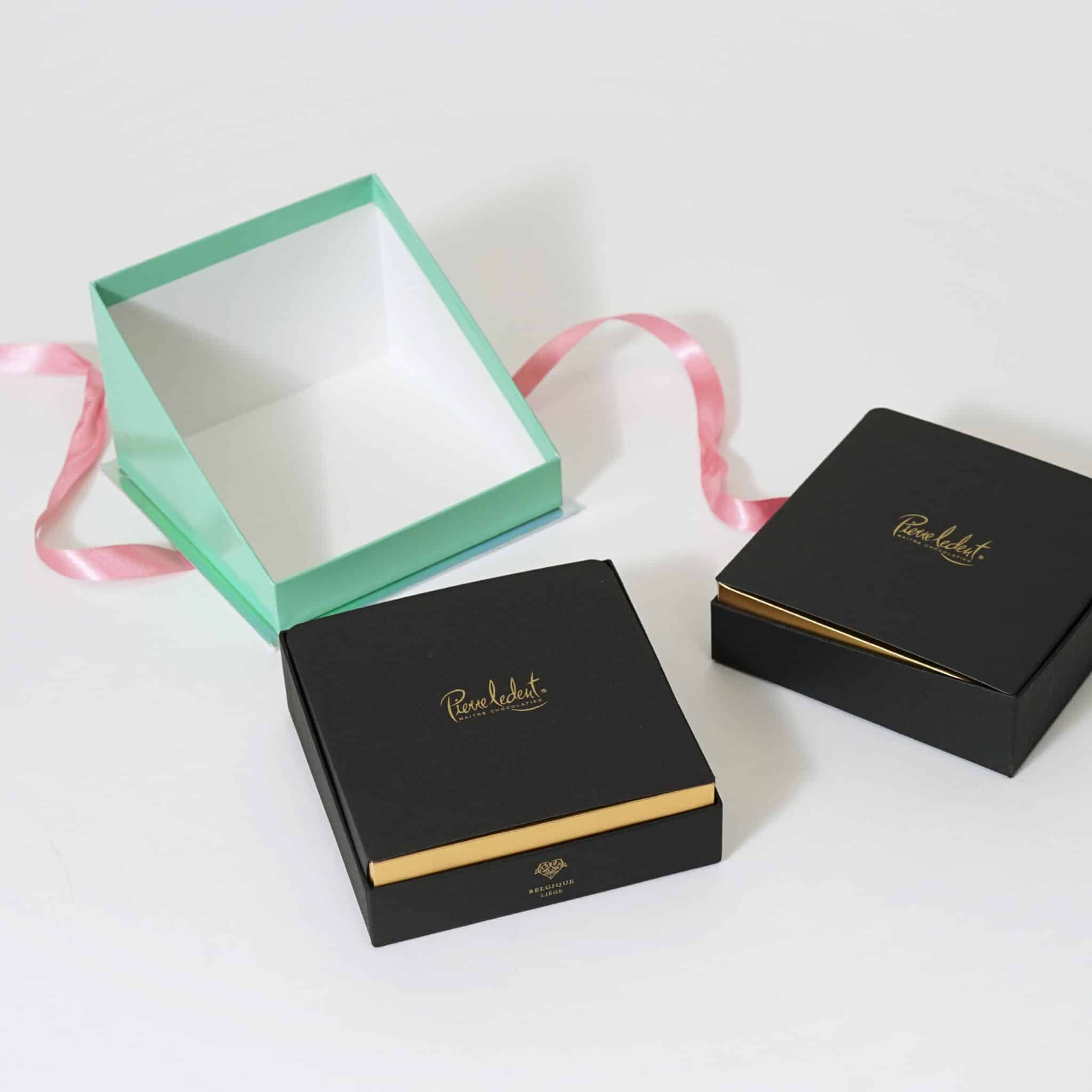 鮮やかで輝きのある外箱とは対照的に、ショコラボックスはブラックでシックに仕上げられています。