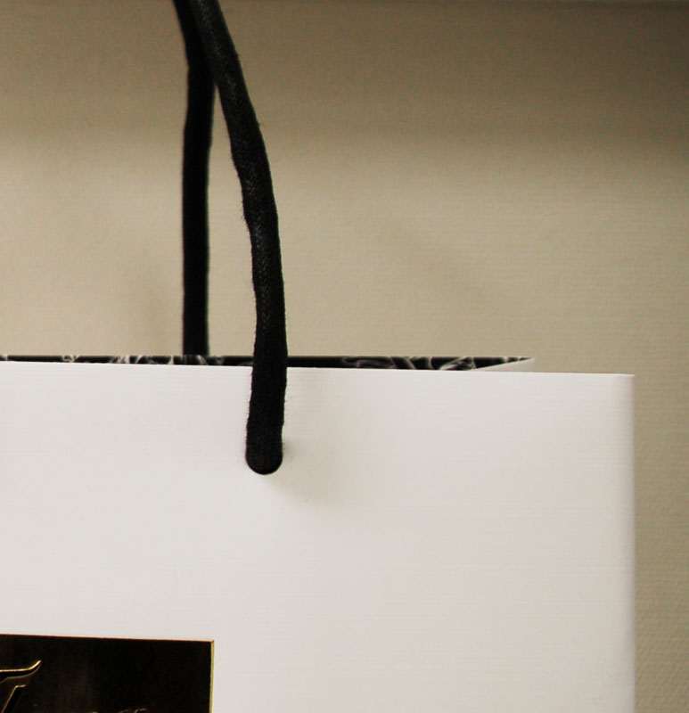 ハイブランドのクールなショップ袋2012年11月06日 こんにちは、ベリービー辻です。 今日はハイブランドのクールなショップ袋を ご紹介します。 太めの紐がカッコイイですね。 ボディはゴールドの蒸着紙にホワイト×ブラックの印刷。 ホワイトの部分にはエンボスがかけられています。 ロゴ部分のゴールド部分もプレスされていて まるで箔押しのようです。 内側も全面に柄が印刷されています。 随所のつくりに高級感を感じますね! さすがハイブランド。クールなショップ袋です!!