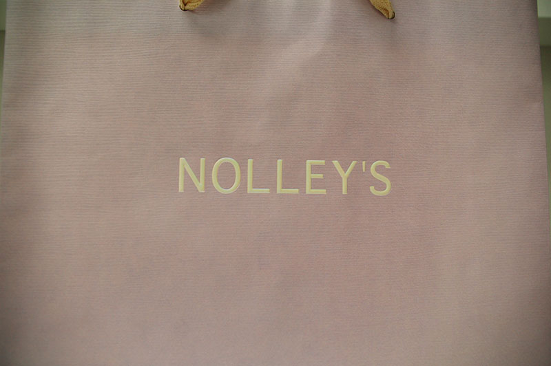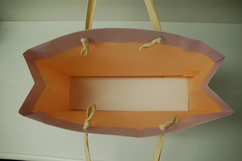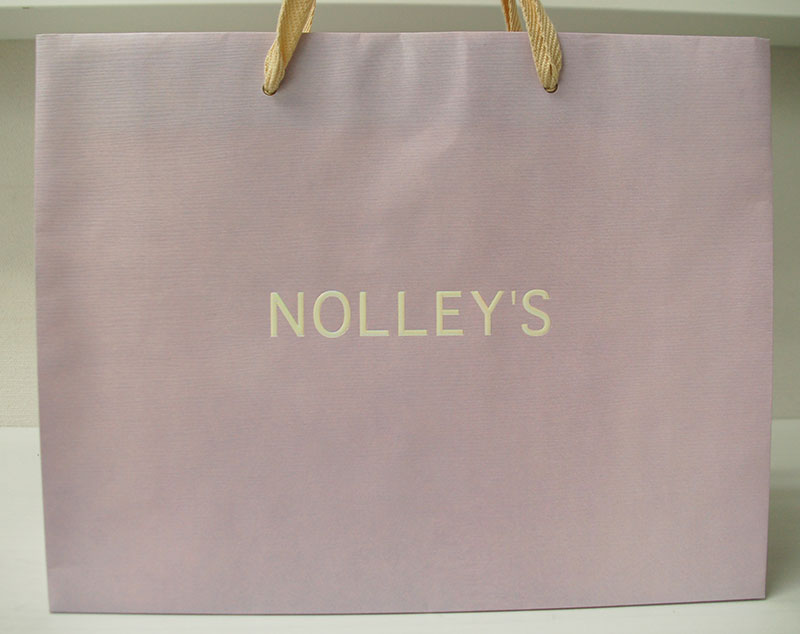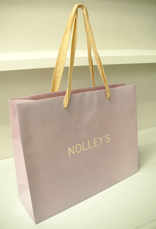 ラブリーの藤色が素敵な紙袋2012年11月08日 こんにちはベリービーの芦谷です。 今日は女性に人気のある藤色を使った紙袋をご紹介します。 やさしい藤色のベースにコットン素材の平紐がかわいいですね。 ロゴマークはパール箔の浮き出し。 ベースにはエンボスが全面にかかっています。 内面にはこちらも女性に人気のあるクリーム色が表面と補色対比になっていますね。