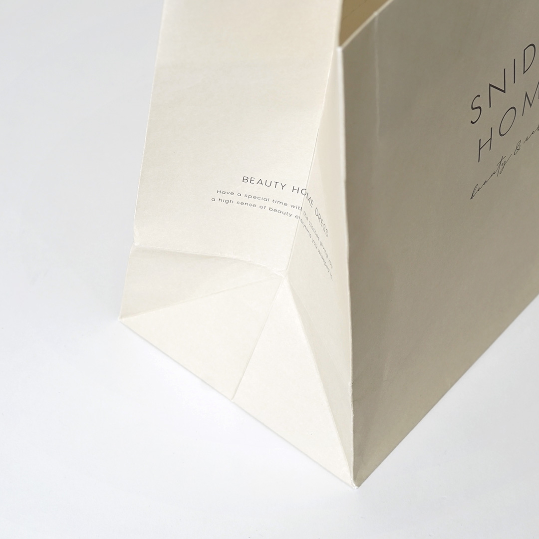 紙袋のマチ部分には、さりげなくブランドコンセプトの英文が記載されています。このように英文をさらっと配置するだけで、まるで北欧デザインのような洗練されたおしゃれ感をプラスすることができます。ブランドの想いやイメージを、よりダイレクトに、そしてスタイリッシュに伝える効果的な手法ですね。
