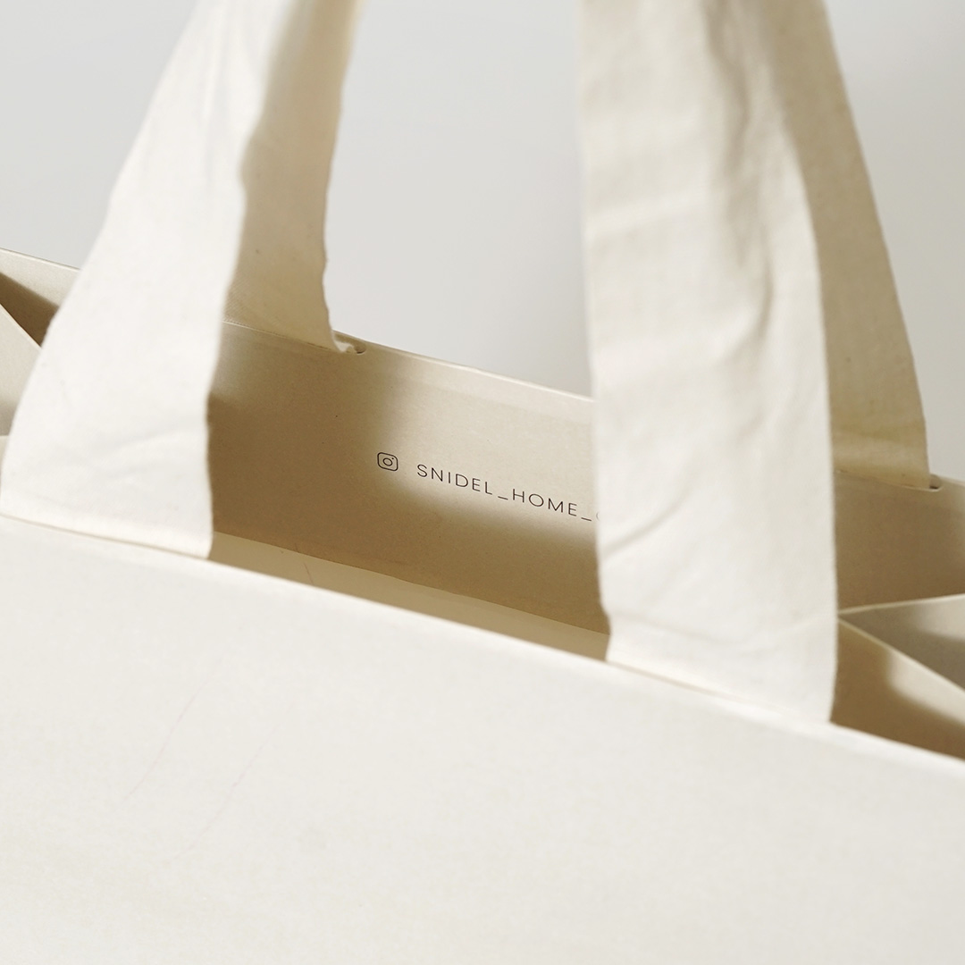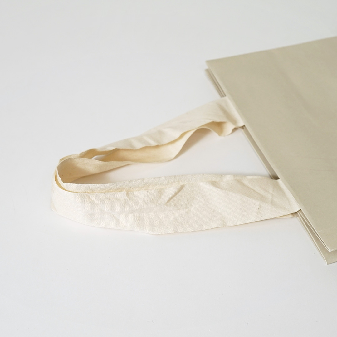 こちらの紙袋のハンドルには、自然由来のコットンが使用されています。紙袋本体のナチュラルな印象と相まって、素材感のこだわりを感じさせますね。ライフスタイルに馴染みやすいデザインなので、購入後もインテリアの一部として飾ったり、ちょっとした収納アイテムとして普段の生活で再利用したりと、長く愛用してもらえる工夫が凝らされています。