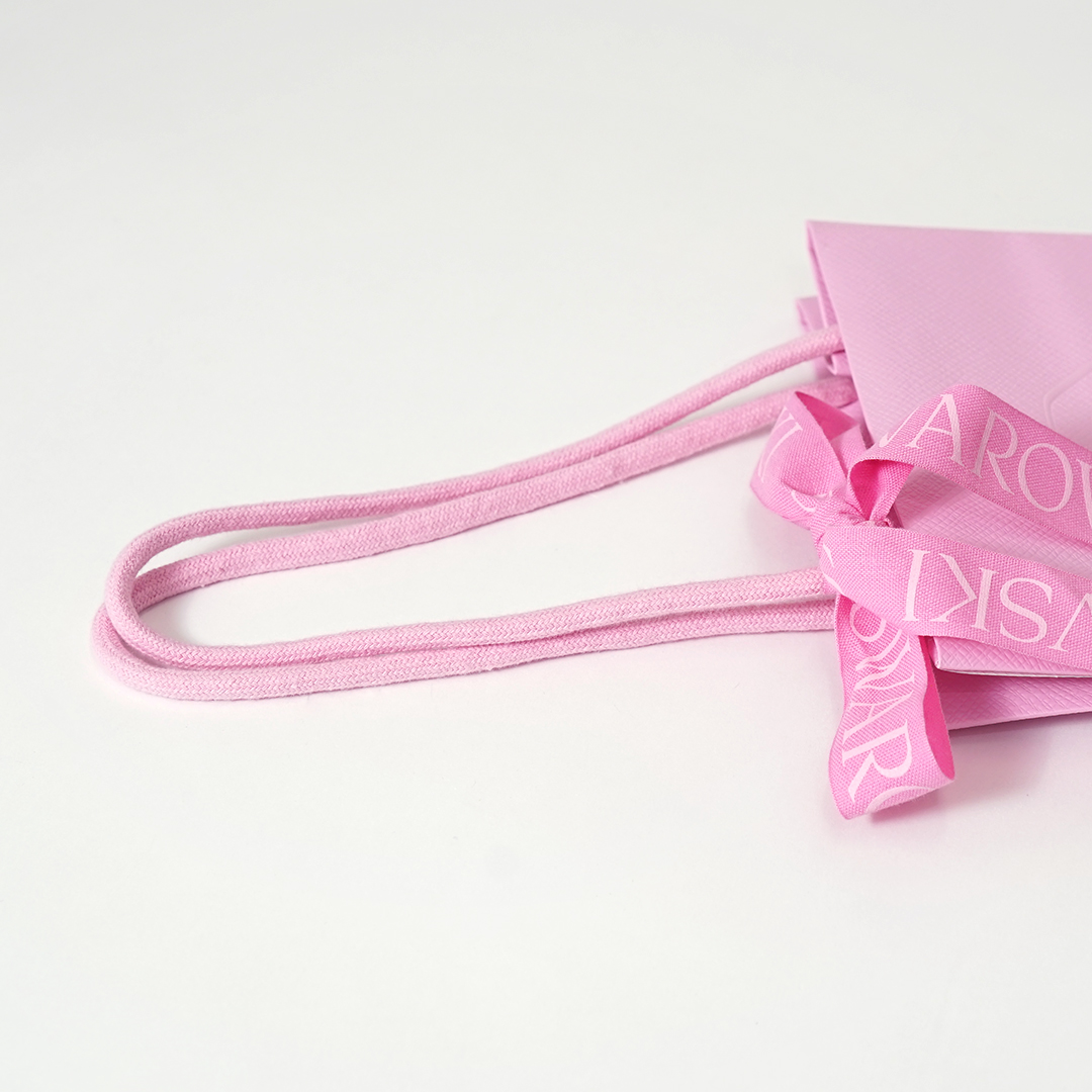 このリボンはやや幅広に作られているため、小ぶりなジュエリーブランドのショッパーも、より繊細で高級感あふれる印象になります。