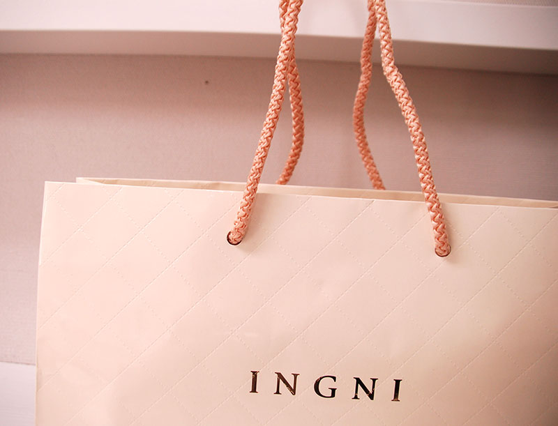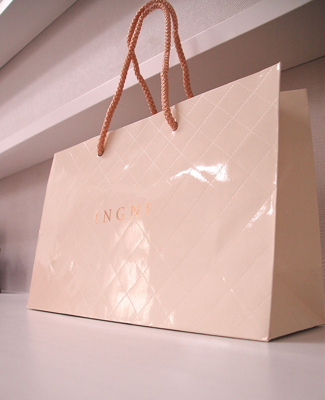 フェミニンなヌードピンクがかわいい紙袋2012年11月19日 こんにちはベリービーの芦谷です。 今日はとってもフェミニンなヌードピンクがかわいい紙袋をご紹介します。 素敵なピンクのボディーの表面にステッチ柄がエンボスされています。 紐はしっかりめのパイレンロープを使用しています。 シンプルでかわいい紙袋ですね。