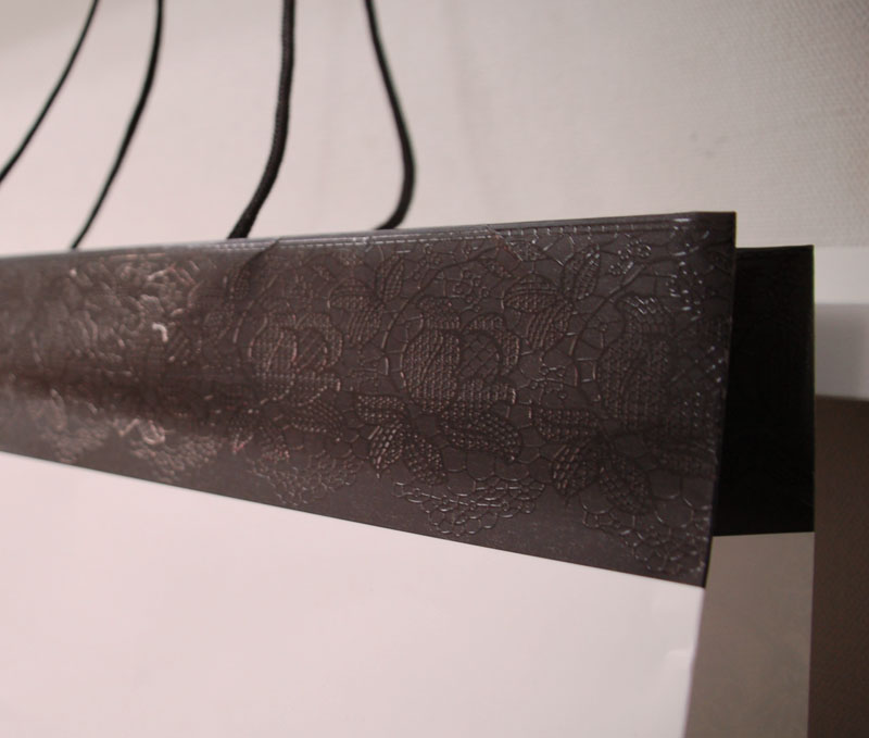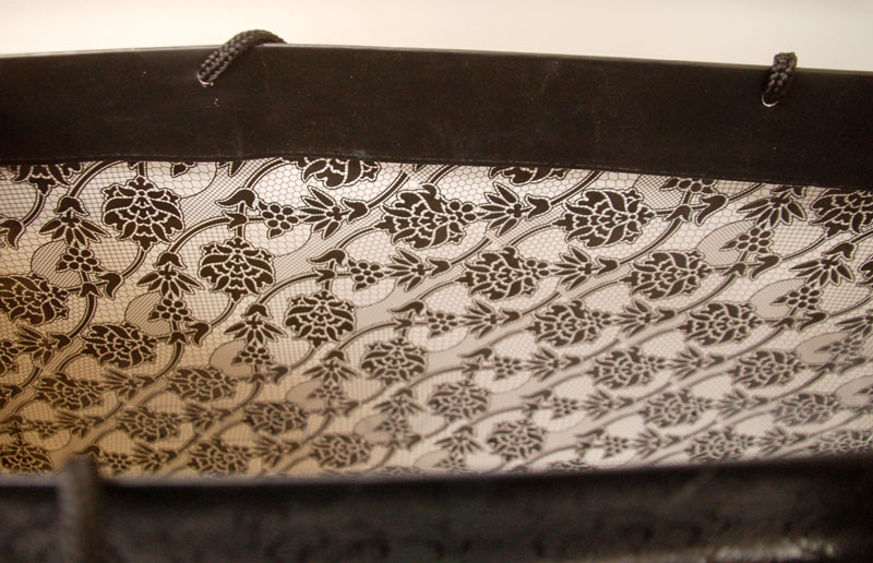 ラグジュアリーなショップ袋2012年11月20日 こんにちは、ベリービー辻です。 今日はラグジュアリーで おしゃれなショップ袋をご紹介します。 一見、普通のショップバッグですが… 黒い部分にレース柄が UV印刷されていて とってもおしゃれ!! さらに内面も!! ロゴは箔押しです。 このブランドはいつも素敵な ショップ袋を制作しています。 ショップ袋も単なる"商品を入れる袋"ではなく 立派なブランディングツールですね!!
