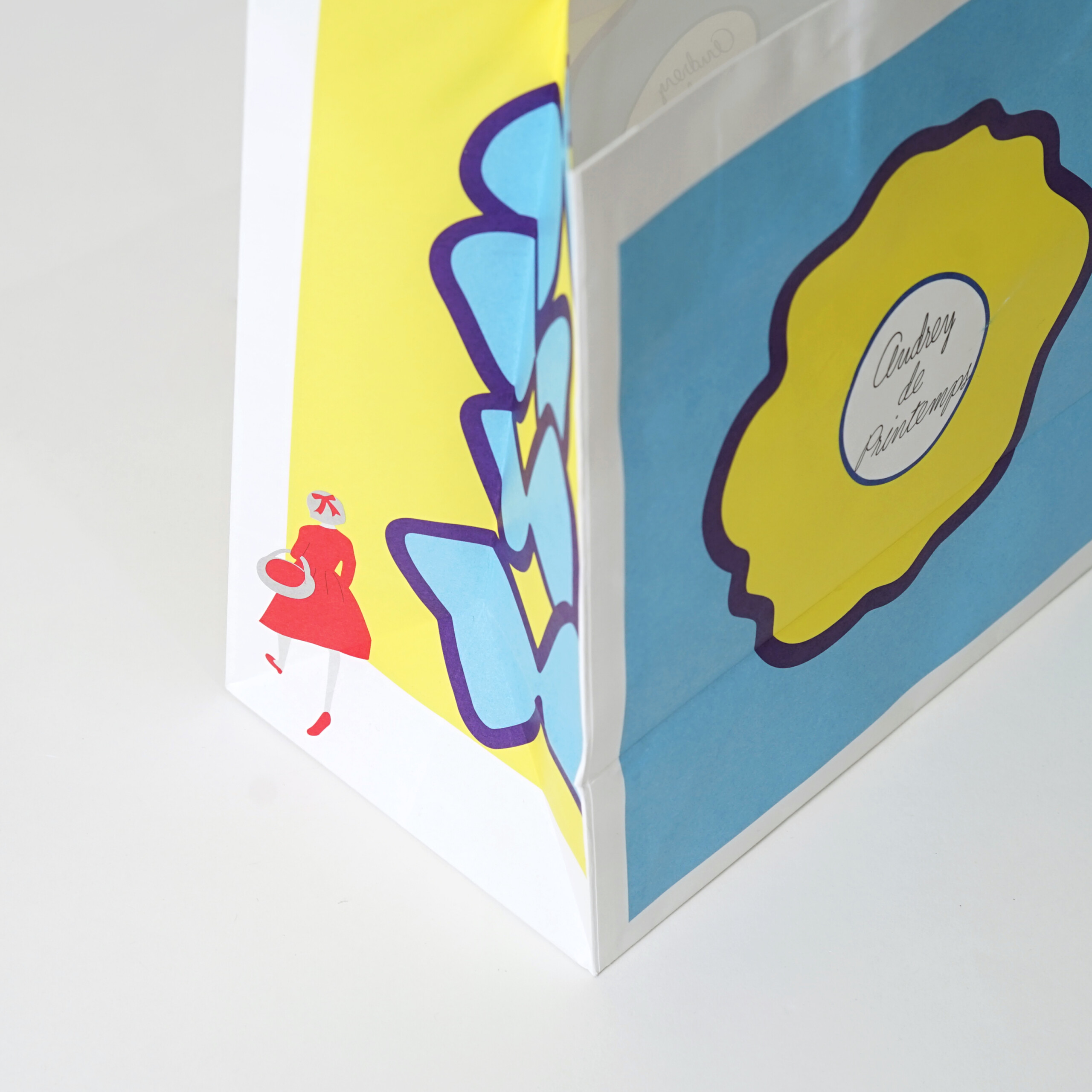 さらにマチ部分にも注目!連なる蝶々のイラストがプリントされており、その側を歩くのはブランドのヒロイン「オードリー」。細部にまで描かれた軽やかで明るい世界観が、まさに春の訪れを物語っています。