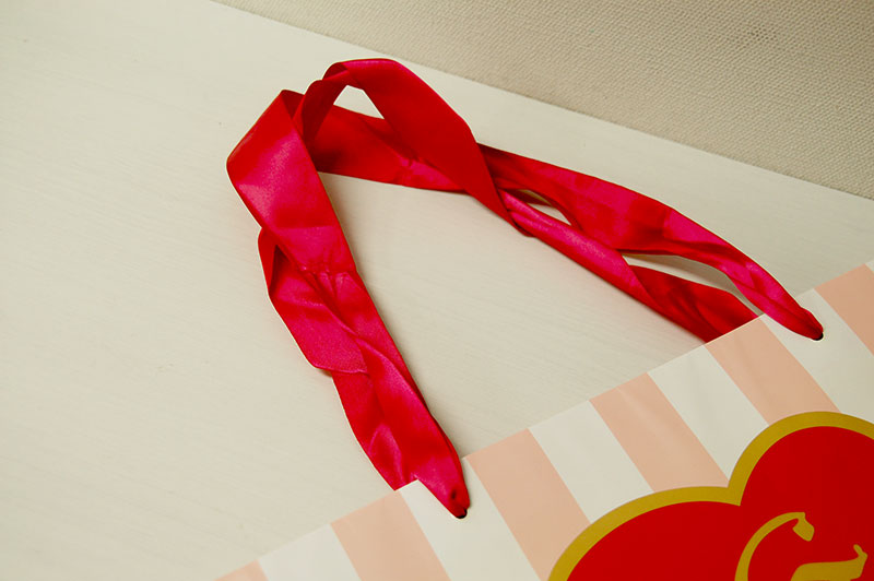 リボンがキュートな紙袋2012年12月01日 こんにちはベリービーの芦谷です。 今日はキュートなサテンリボンの紙袋をご紹介します。 かわいいピンクのコントラストが素敵な紙袋です。 全体に配置されたベビーピンクのストライプがとってもオシャレです。 表面はグロスPP貼り。ギャル系のブランドに多い仕様ですね。 フーシャピンクのサテンリボンがこの紙袋の最大のポイントですが 可愛さをとっても強調しているアイテムです。