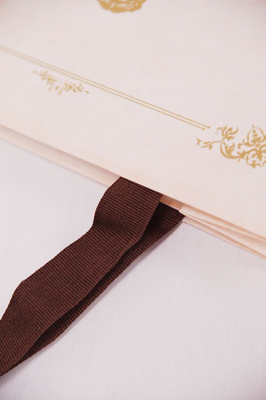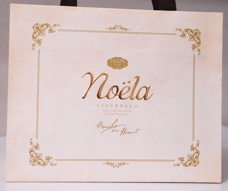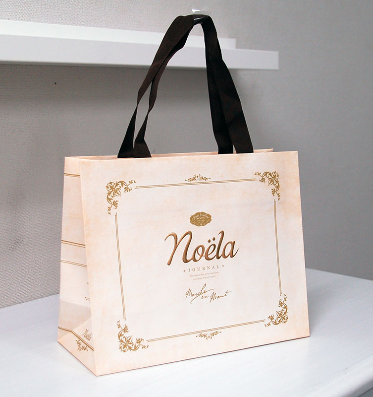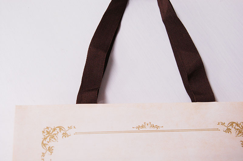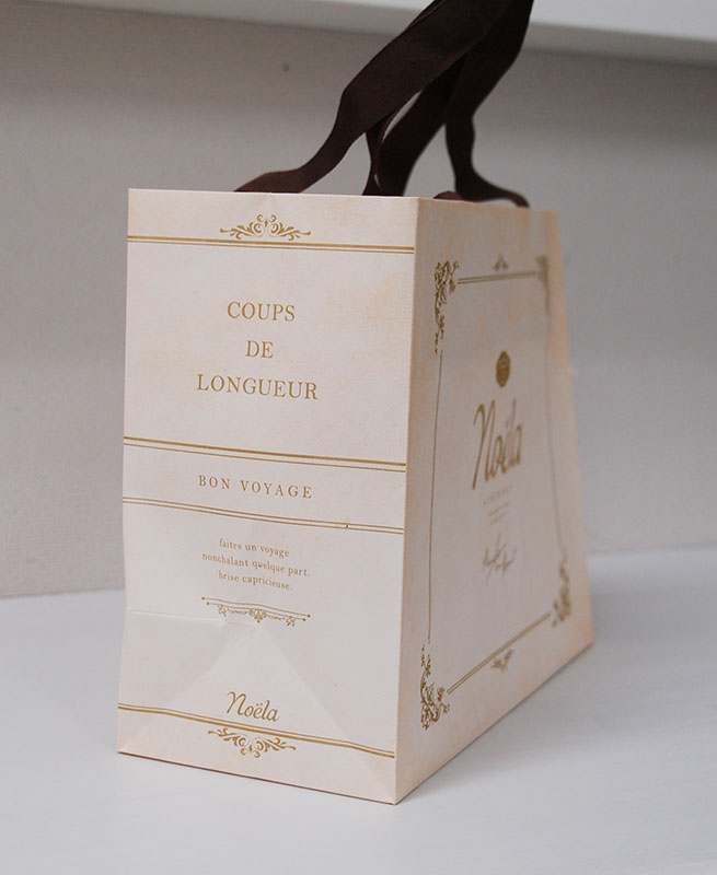 アンティークBOXのような紙袋2012年12月03日 こんにちはベリービーの芦谷です。 今日はアンティークの小箱のようなデザインの紙袋をご紹介します。 薄いピンク色のベースにかわいいデザインが素敵な紙袋です。 正面には浮きだしゴールドつや消しのロゴがプリントされています。 サイドのデザインはまるで中世の書籍のようですね。 手提げ紐はグログランテープを使用。縦穴留めでスッキリデザインです。