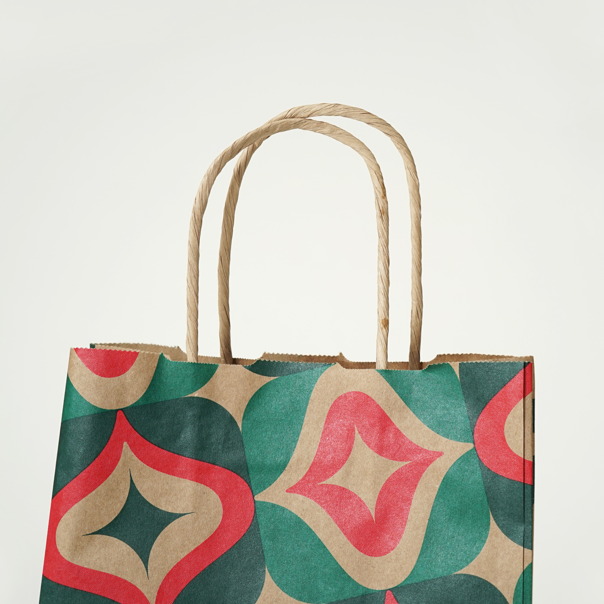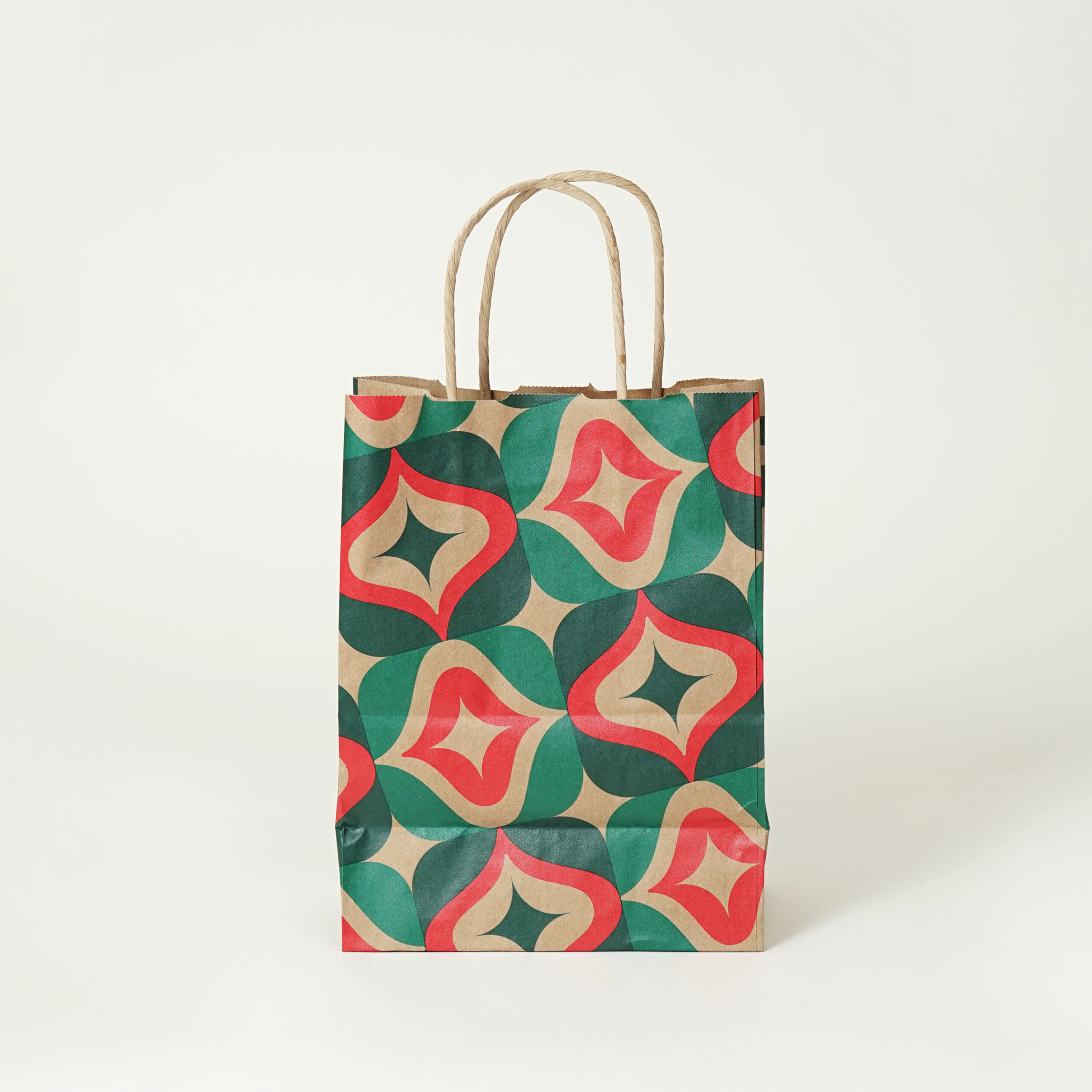 マチから裏面にかけては、クリスマスカラーで彩られたオーナメントのような総柄が印刷されています。