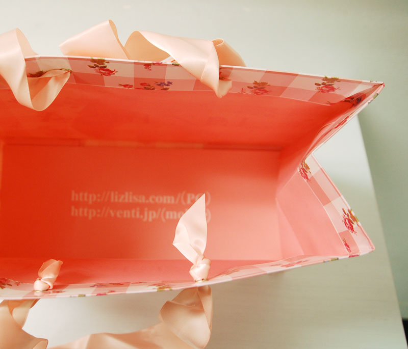 大きいリボンのラブリーなショップ袋2012年12月04日 こんばんは、ベリービー辻です。 今日のショップ袋はとってもラブリーです!! 太めのリボンのバランスが最高です! ロゴは浮きだし箔。 内面もピンクでラブリーです。 思い切った太さのリボンがとってもステキな ショップ袋ですね!!