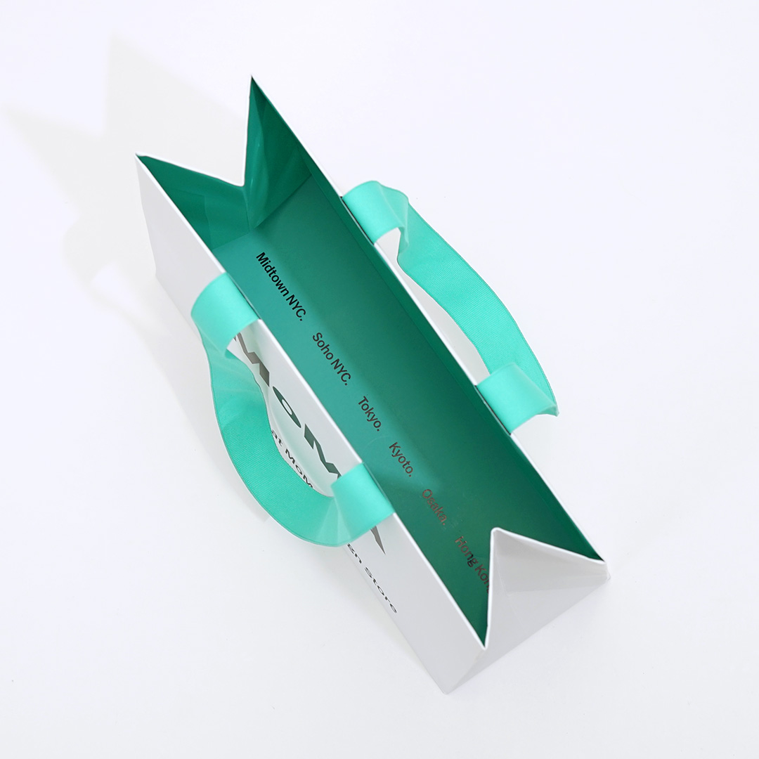 紙袋の内側にまでこだわりが!ハンドルと同じエメラルドグリーンが配色され、底面にはなんとショップリストがデザインされています。