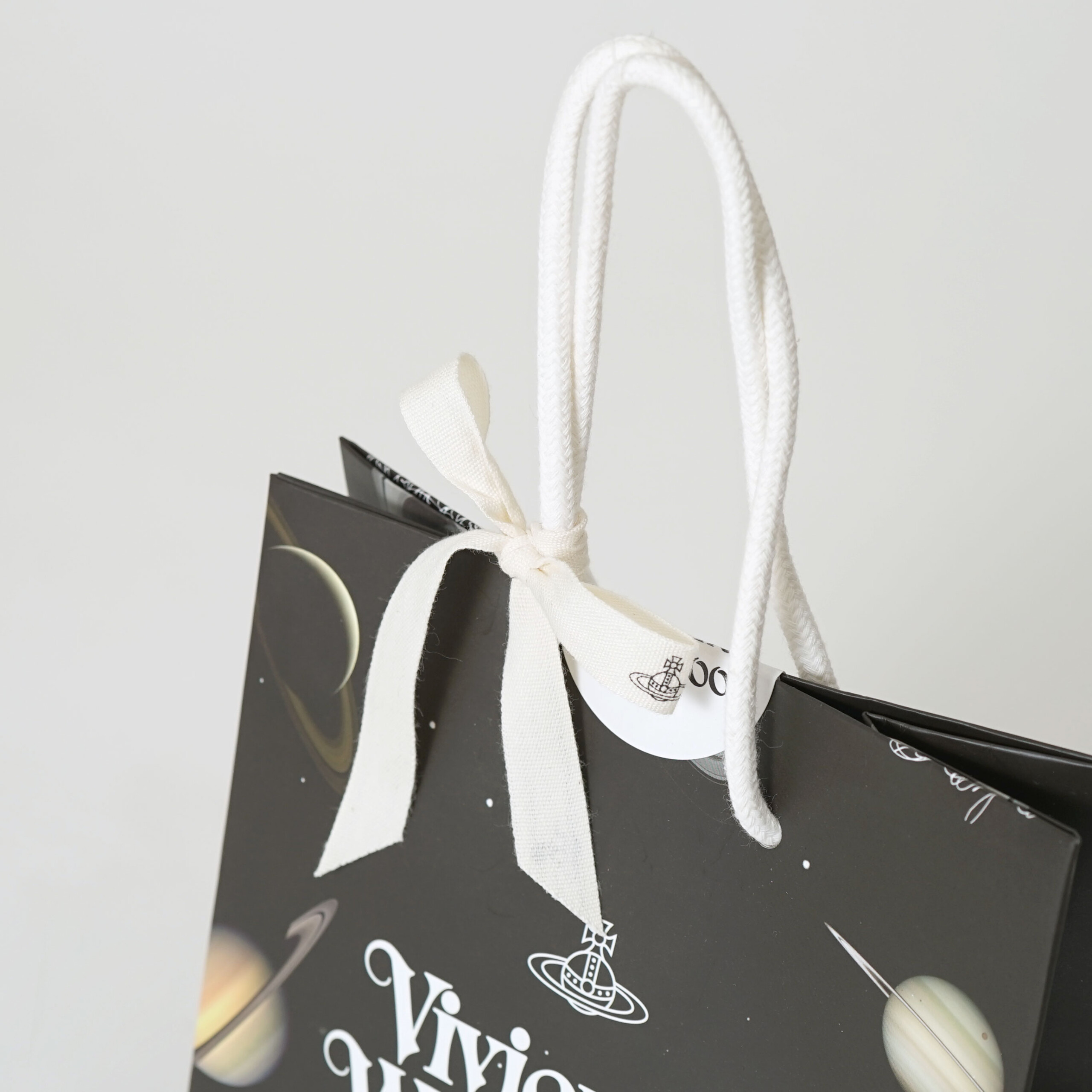 ハンドル部分にはブランドのロゴマークがプリントされたオリジナルリボンが結ばれており、