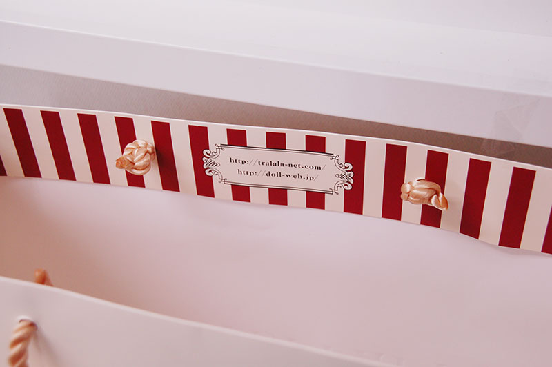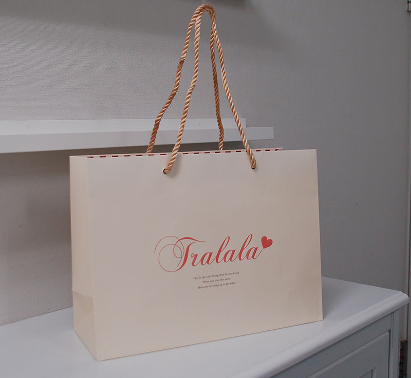 とってもキュートな紙袋2012年12月19日 こんにちはベリービーの芦谷です。 今日もとってもキュートな紙袋をご紹介します。 かわいいクリーム色のベースにパールの入ったピンクのロゴマークの組み合わせです。 ロゴマークは可愛さを強調するような浮き出し処理がされています。 手提げ紐はシャイニーなツイストロープです。 口折りにストライプは近頃の定番ですね。 URLをかわいい飾り罫に囲んでいるところが素敵です。