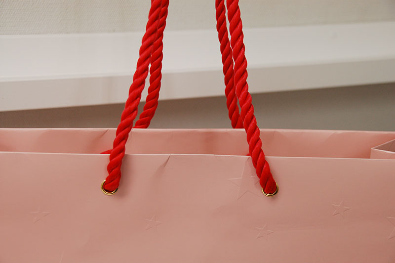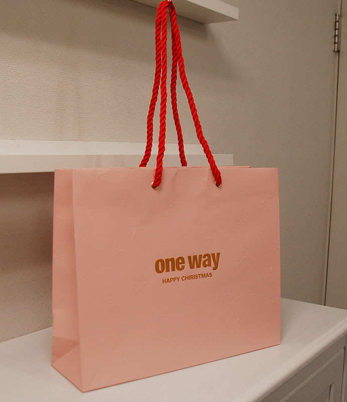本日も遅れてきたクリスマス紙袋2012年12月27日 今日も遅ればせの素敵なクリスマス紙袋をご紹介させていただきます。 かわいいピンクがベースの紙袋です。 今日の紙袋も存在感ある浮き出しのロゴマークです。 紙袋の全面には根強い人気の“スター”が浮き出しエンボスでデザインされています。 ハンドルは華やかな赤色のツイストロープ。ハトメが高級感を盛り上げています。