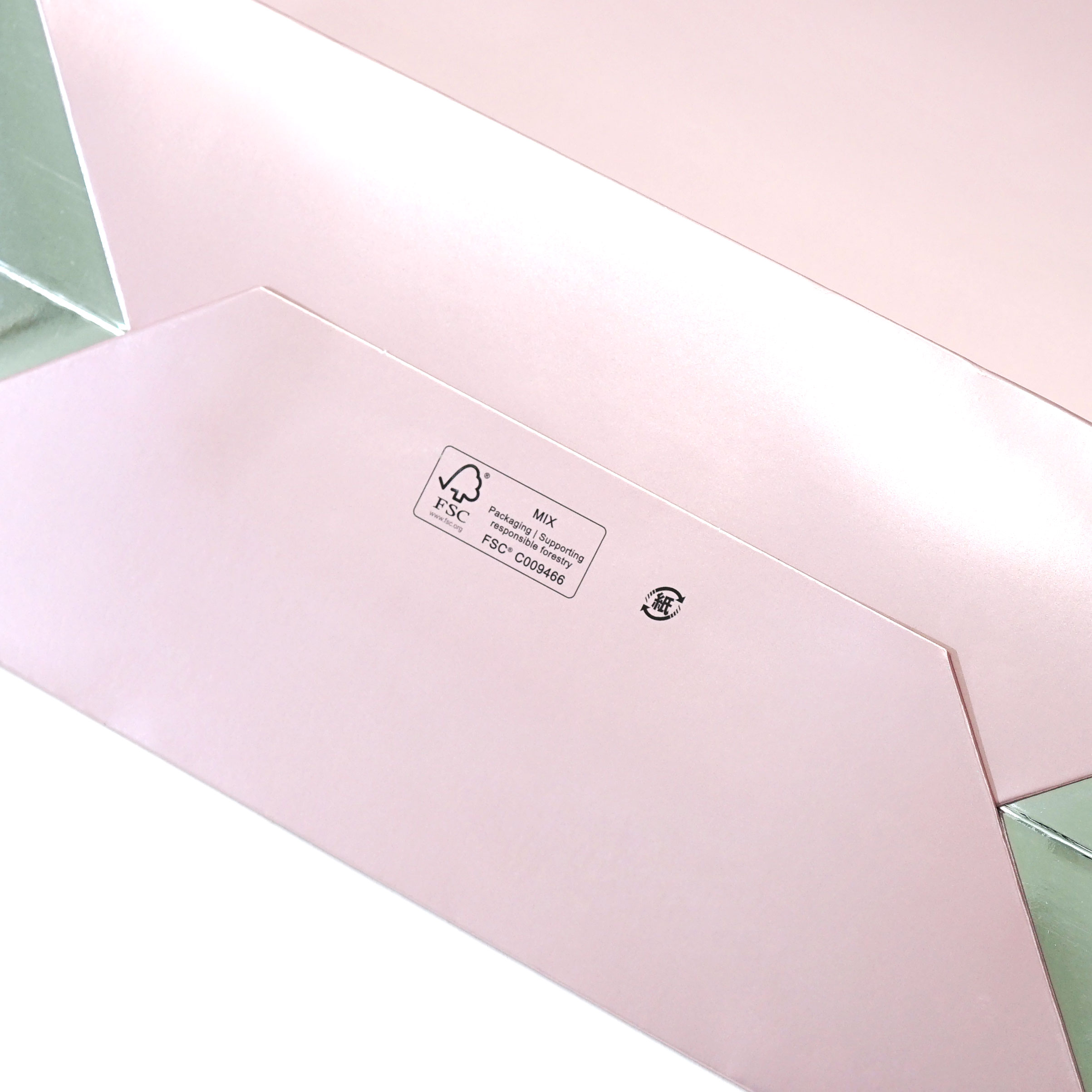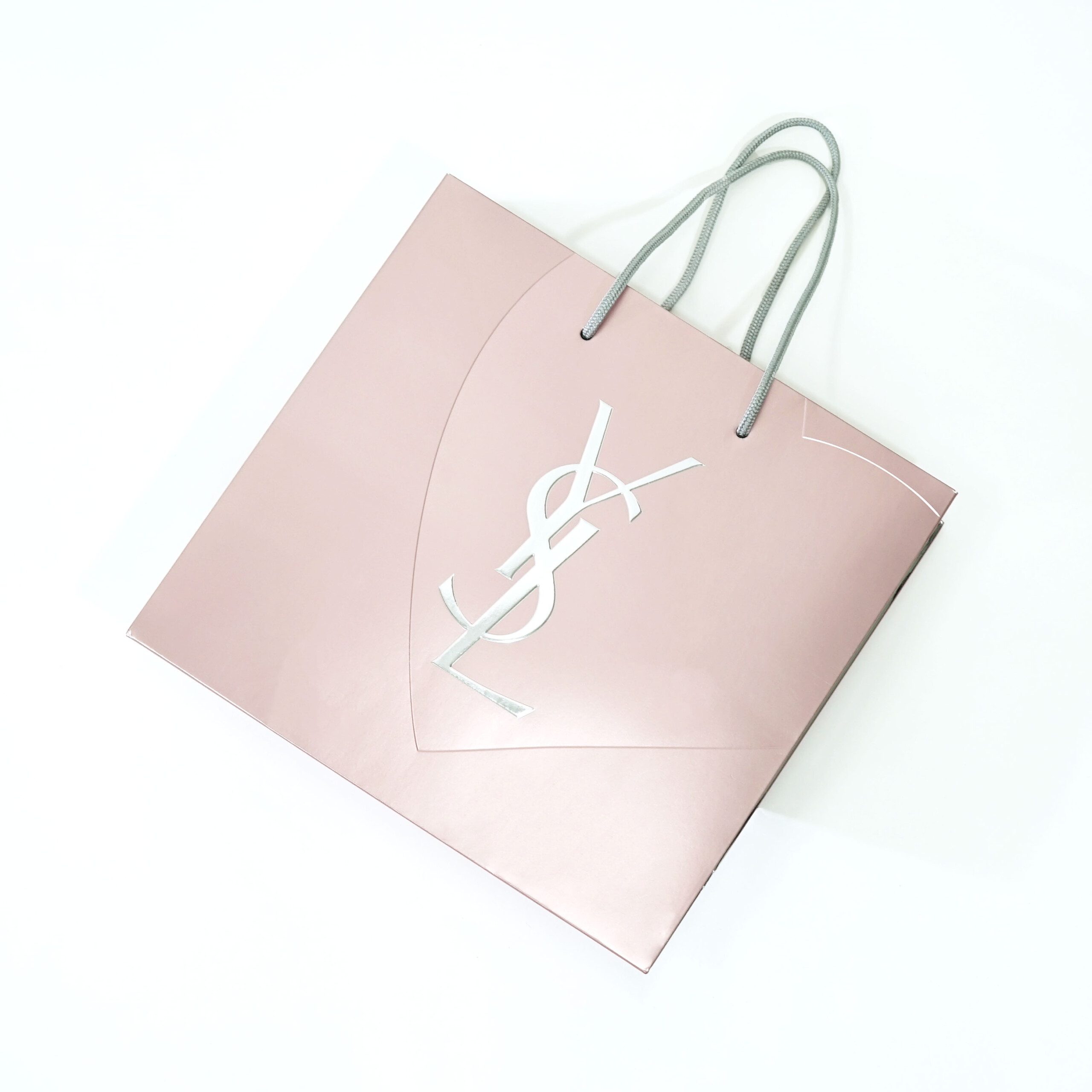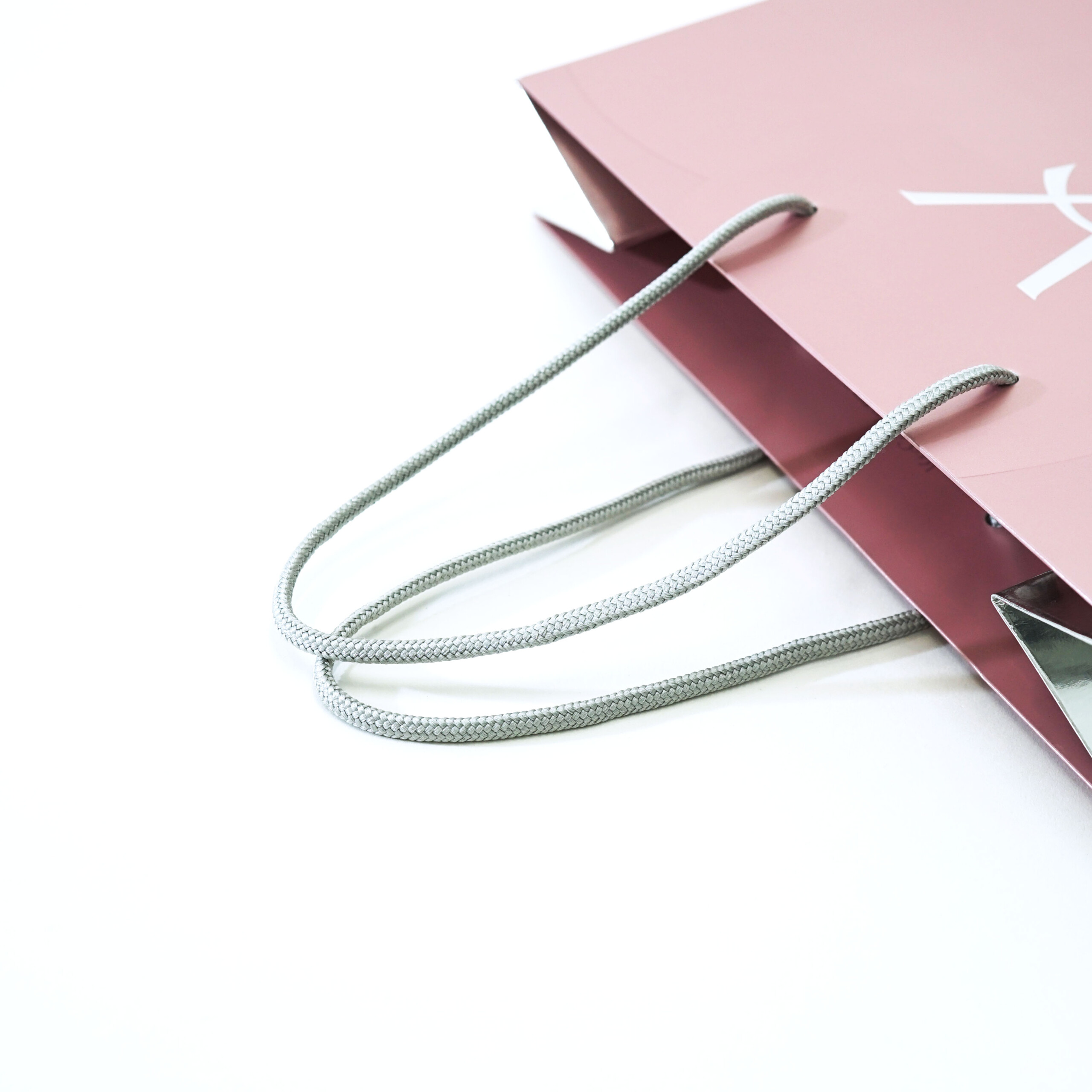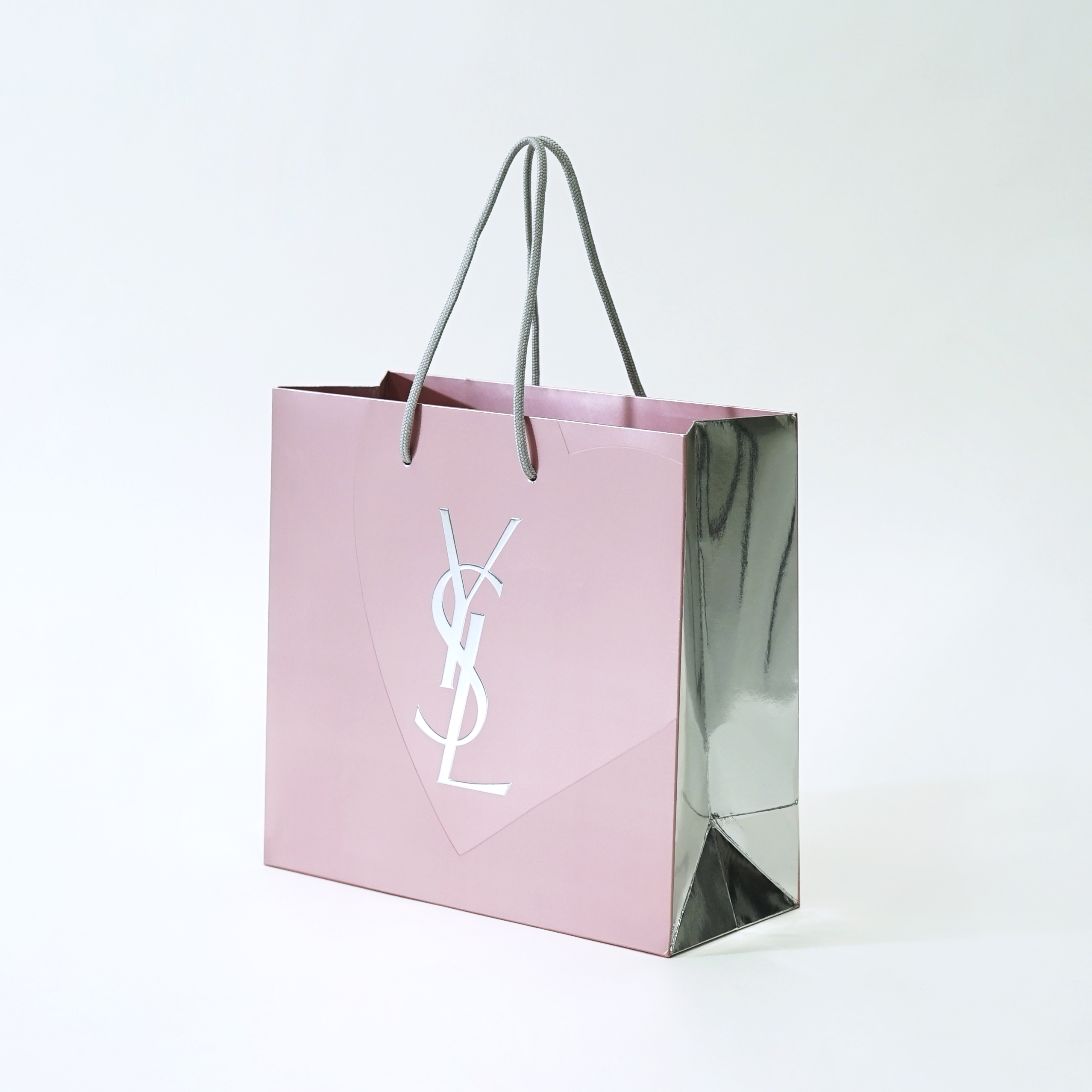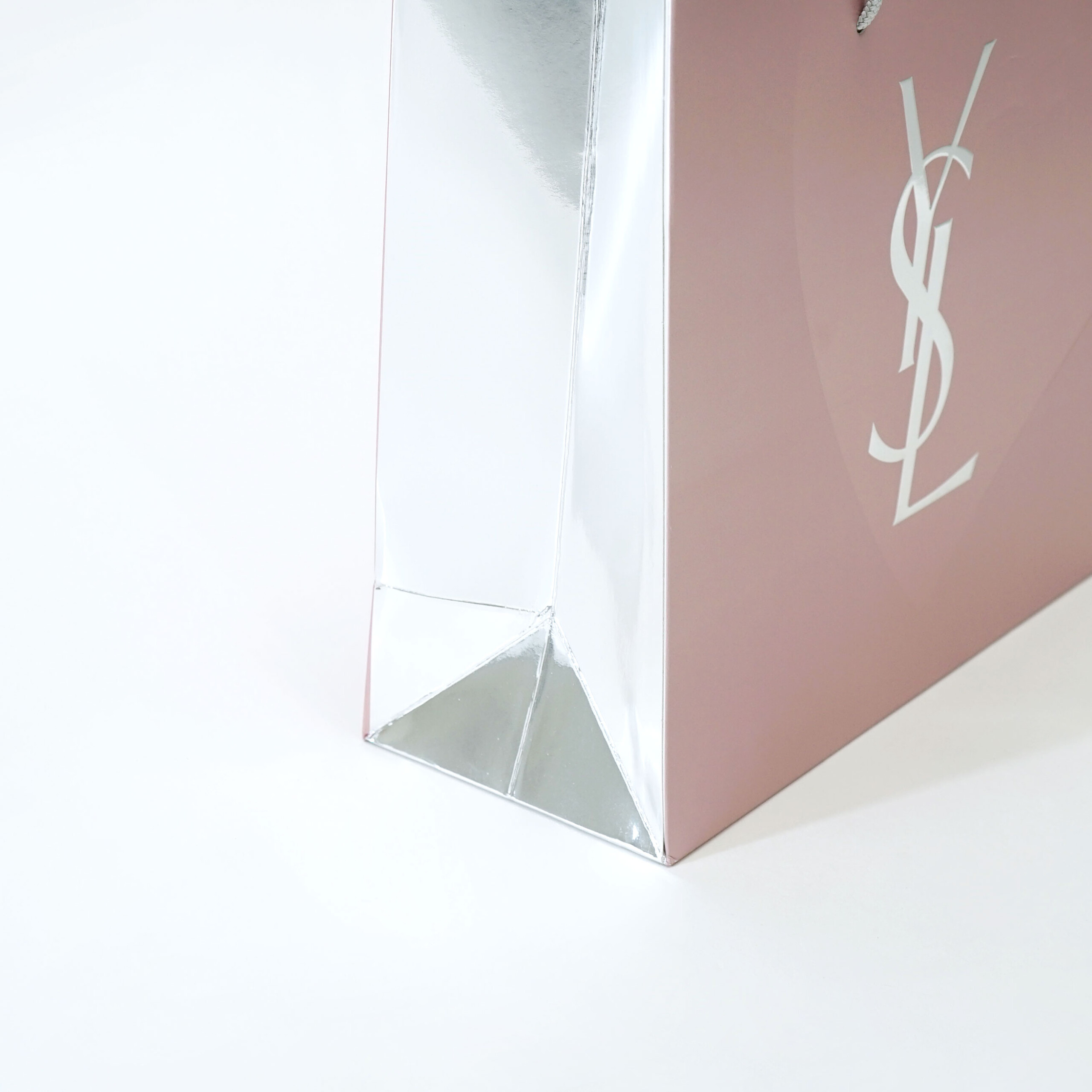 この紙袋全体には、アルミのような艶感が特徴の「蒸着紙」が使用されており、さらに部分的にペールピンクのインクでプリントされています。