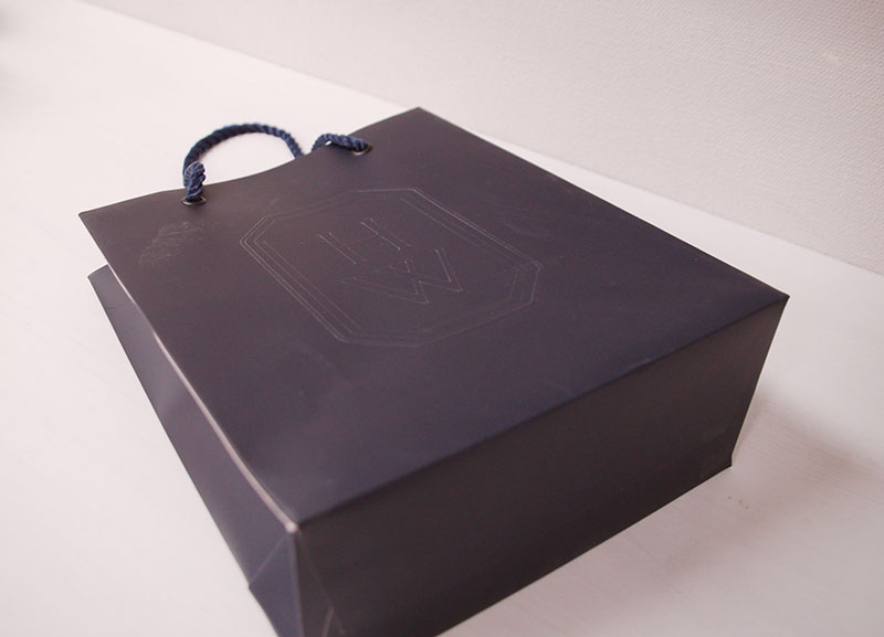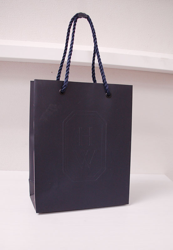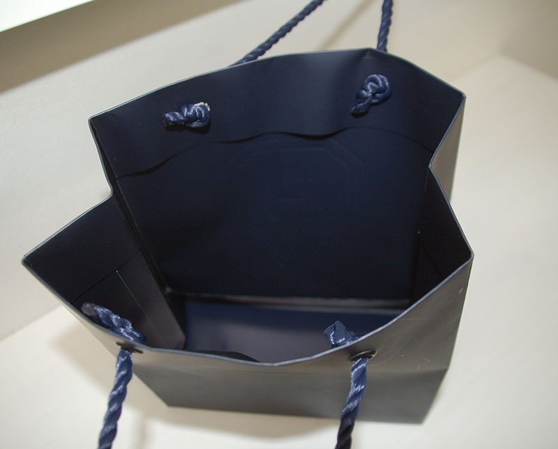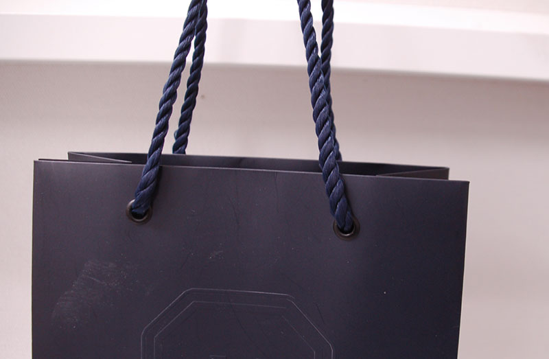 高級ブランドの紙袋を拝見!!2013年01月10日 こんにちは、今日はとっても高級なブランドの紙袋をご紹介します。 重厚感のある紺色が高級感を物語っています。 見た目はとってもシンプルですが 中央にプリントされた浮き出しエンボスのロゴマークもまた高級感たっぷりです。 かなり厚手の用紙に裏表同色を印刷し、 両面にマットPPを貼るという贅沢さです。 高級バッグの象徴であるツイストロープにしっかりと同色のハトメが使われています。 あまり見慣れない色のハトメですが特徴でしょうか?