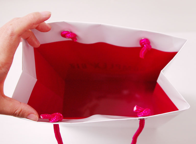 シンプルなショップ袋2013年01月11日 こんばんは、ベリービー辻です。 本日のショップ袋はこちらです! ビビットなピンクとシルバーのハトメの バランスがいいですね! ロゴは浮き出し箔です。 底部分を折っているので 表面に折り目ができません。 内側もピンクが効いています! シンプルですがこだわりを感じる 素敵なショップ袋ですね!