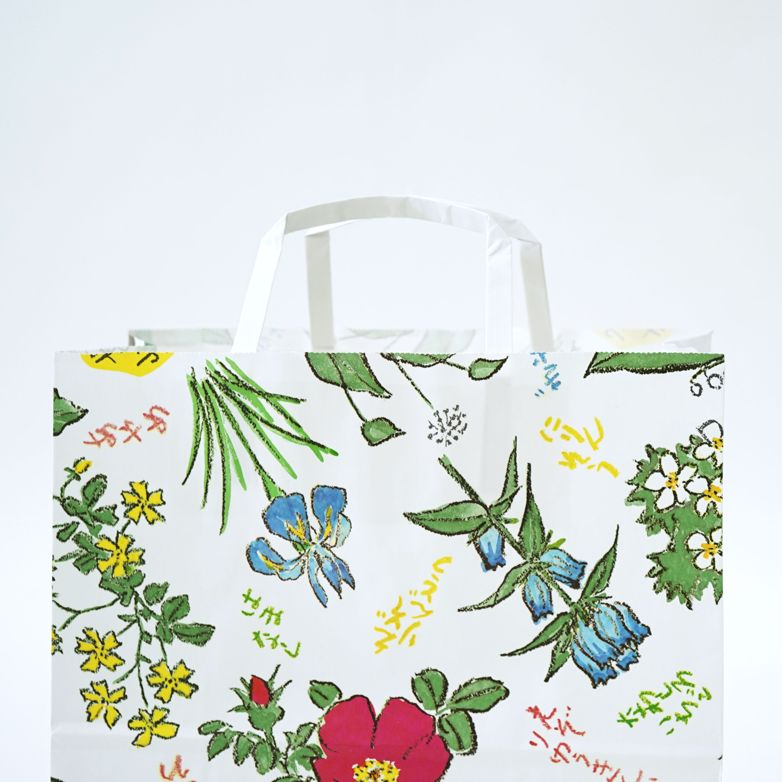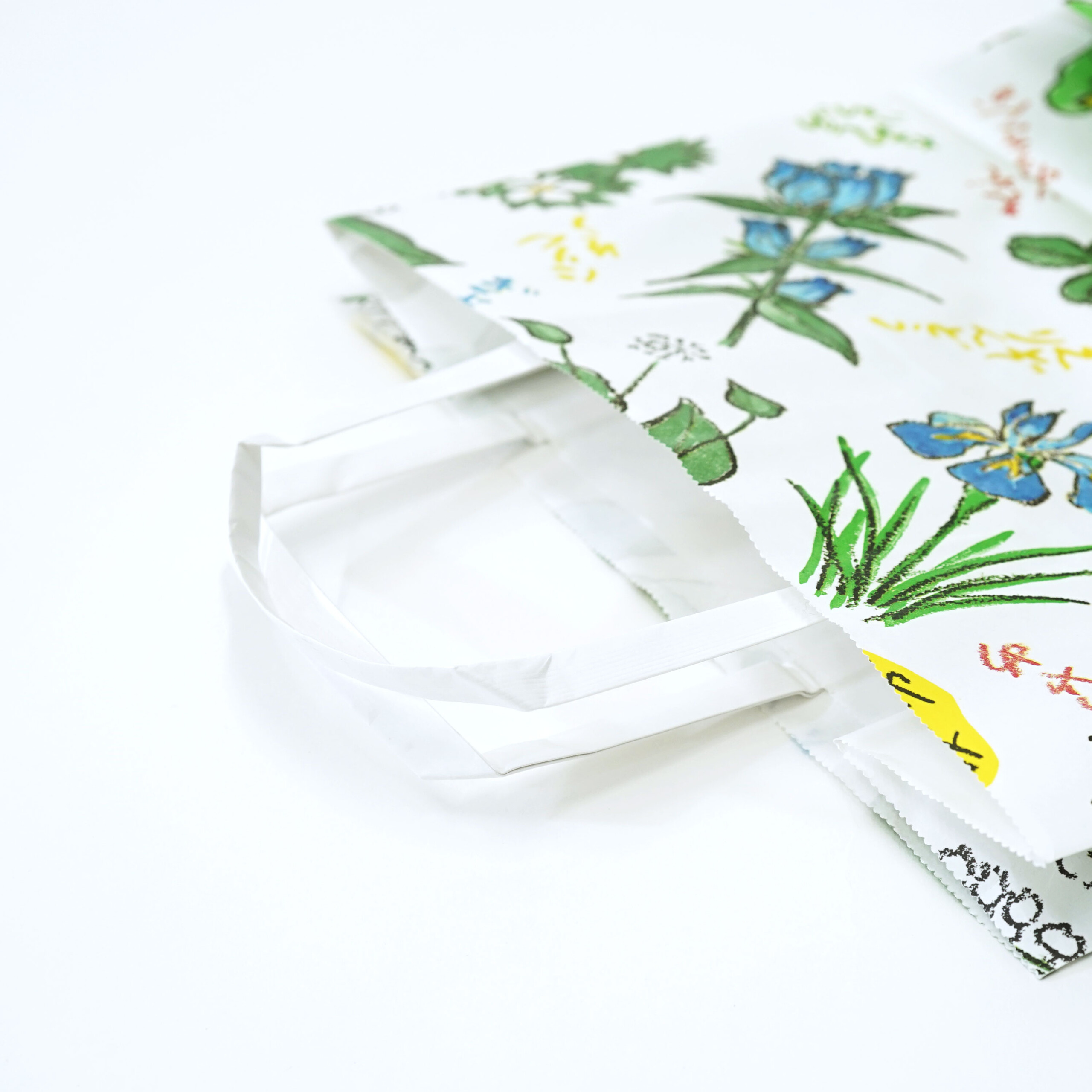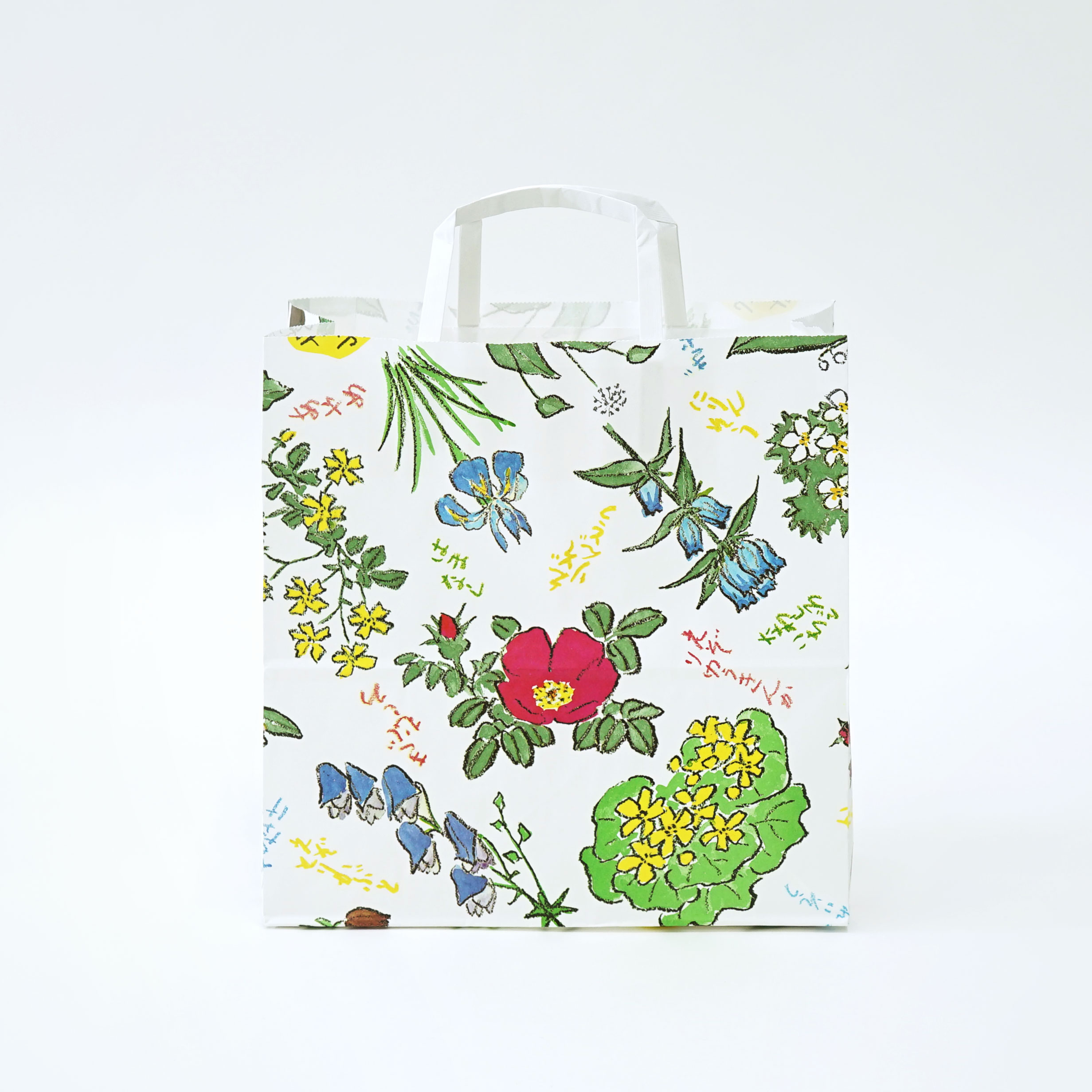 この紙袋には、23種の山野草が描かれており、その中でもエゾリンドウ、ハマナシ、オオバノエンレイソウ、カタクリ、エゾリュウキンカ、シラネアオイの6種類が「十勝六花」として特にピックアップされています。