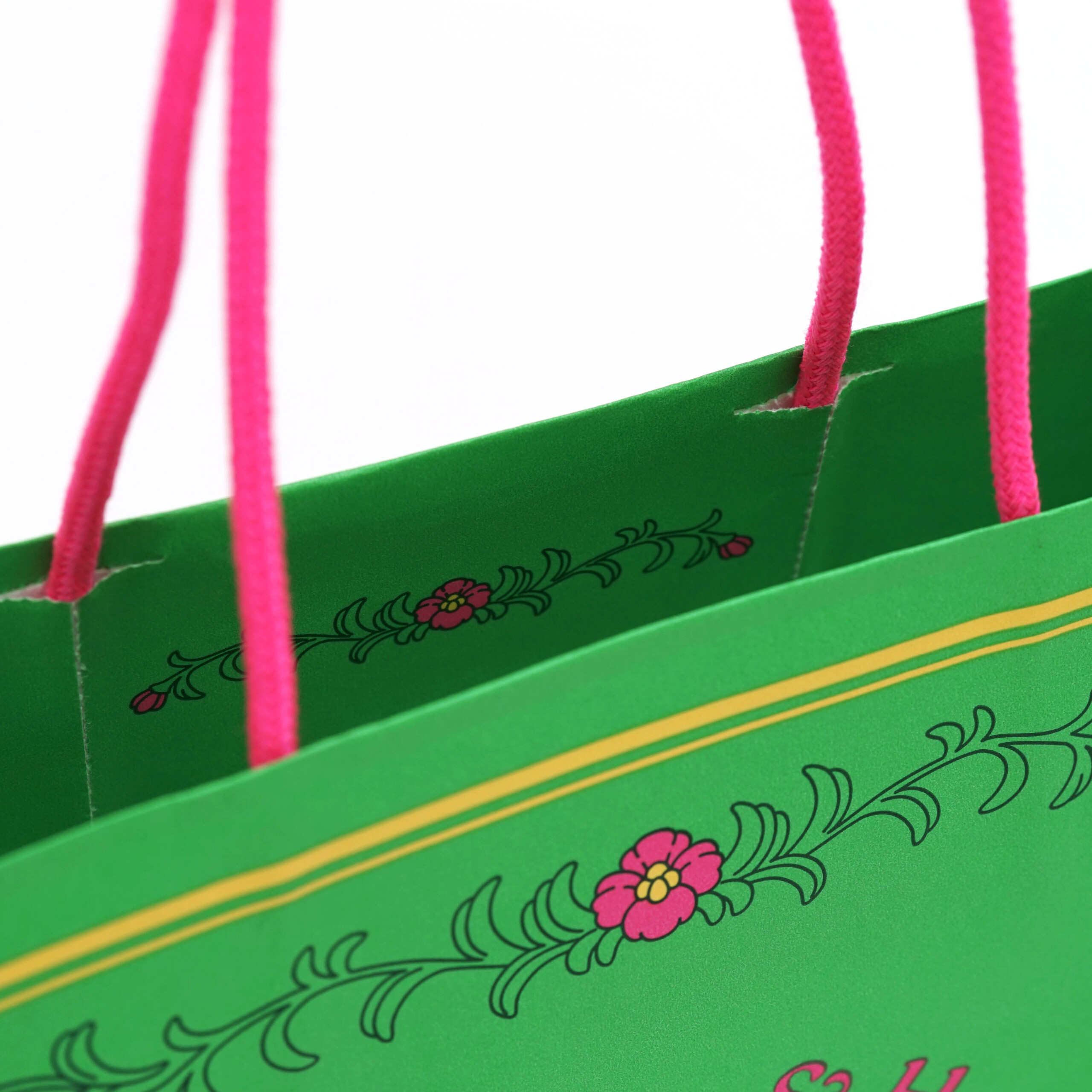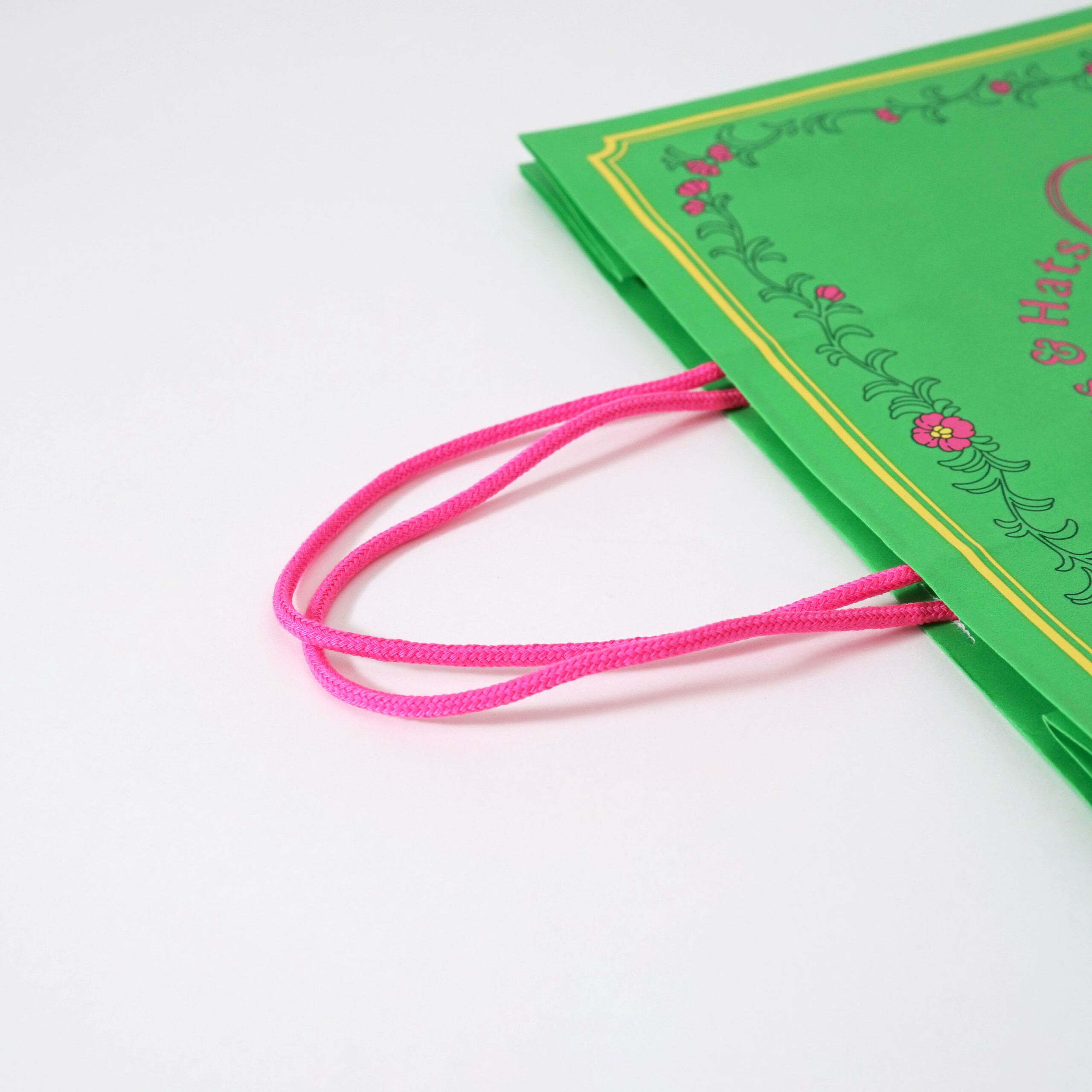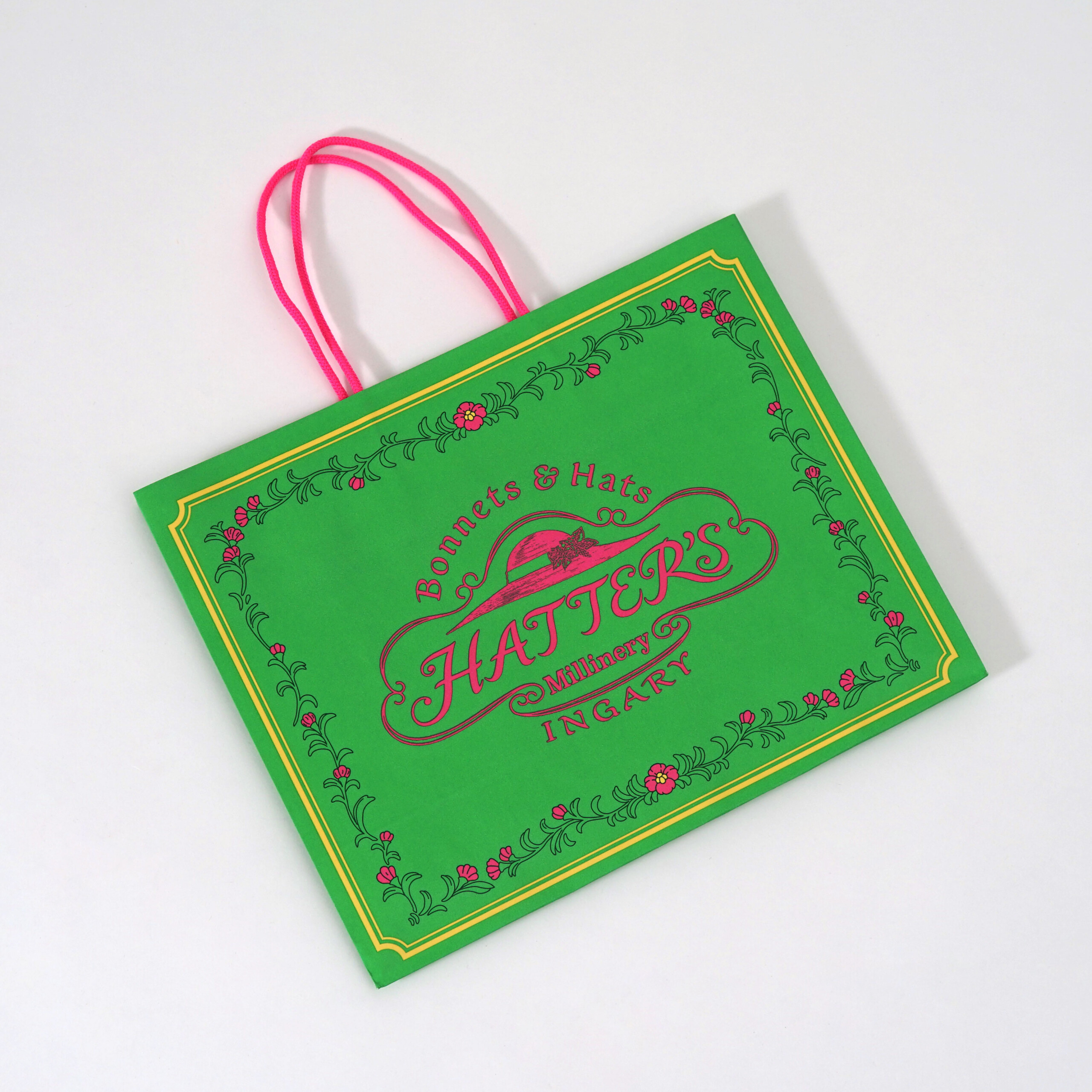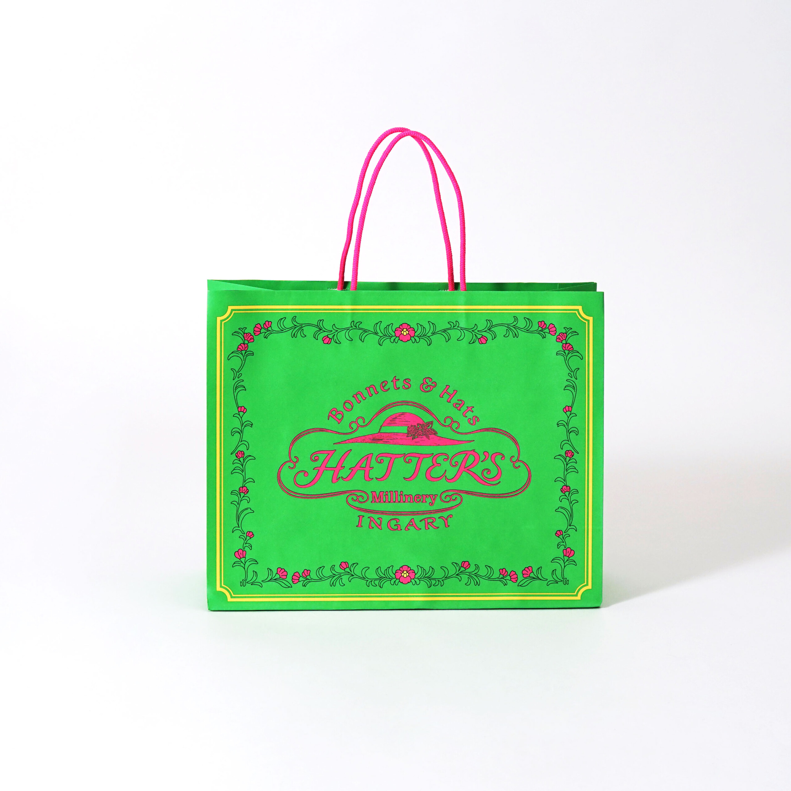 紙袋本体だけでなく、ハンドルにも色を加えることで全体のデザインがより一層鮮やかに強調され、持つ人の目を惹きつけますね。