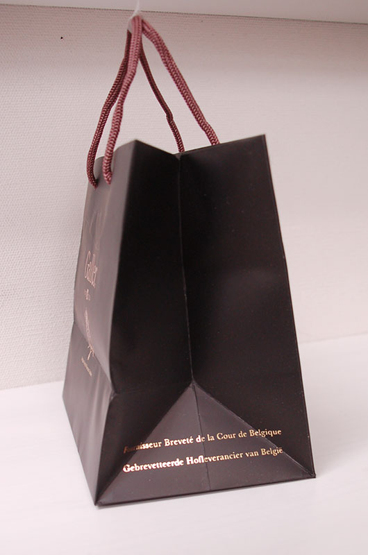 もうすぐバレンタインですね!!紙袋のご参考に2013年01月19日 こんにちはベリービーの芦谷です。 今日も先日に引き続き、チョコレートの紙袋をご紹介します。 チョコレートの紙袋にピッタリなチョコレート色の紙袋です。 私は個人的にチョコレートの袋はあまりポップなデザインより、 少しクラシカルなデザインの方が高級感があっていいと思います。 この紙袋のようにシンプルな箔押しなんて素敵ですね。 サイドにも箔押し処理がされていて、高級感をひときわ高めています。 手提げ紐はシンプルにパイレンロープが使われています。