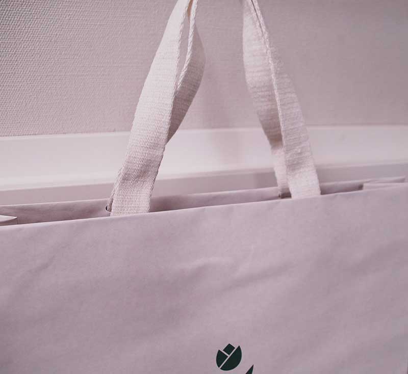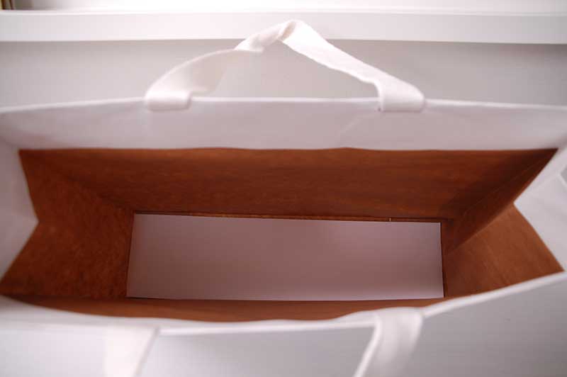 シンプルに白が基調のエコ紙袋2013年02月14日 こんにちはベリービーの芦谷です。 今日はスッキリとした白がきれいな エコな紙袋をご紹介します。 真っ白いベースにシンプルにグリーンのロゴがきれいな紙袋です。 ハンドルも真っ白な厚手の平紐が使用されています。 縦留め仕様でスッキリですね。 内側を見ると未晒しのクラフト紙が見えますね。 やはり、紙袋もエコを意識する物が多くなってきました!!