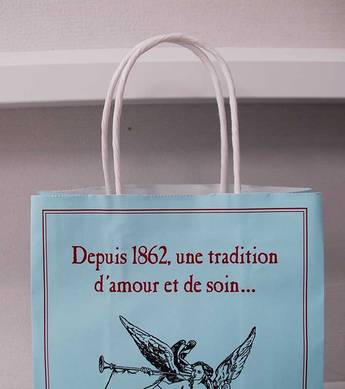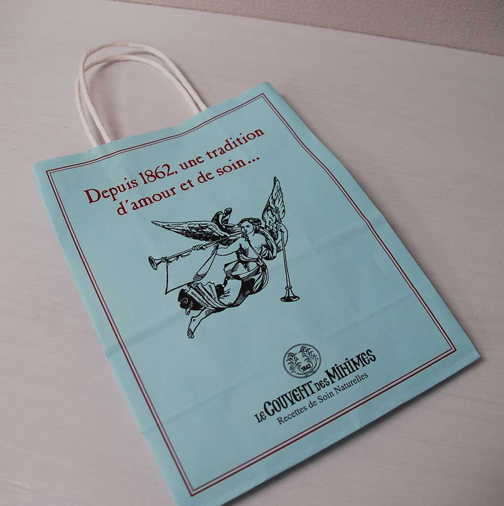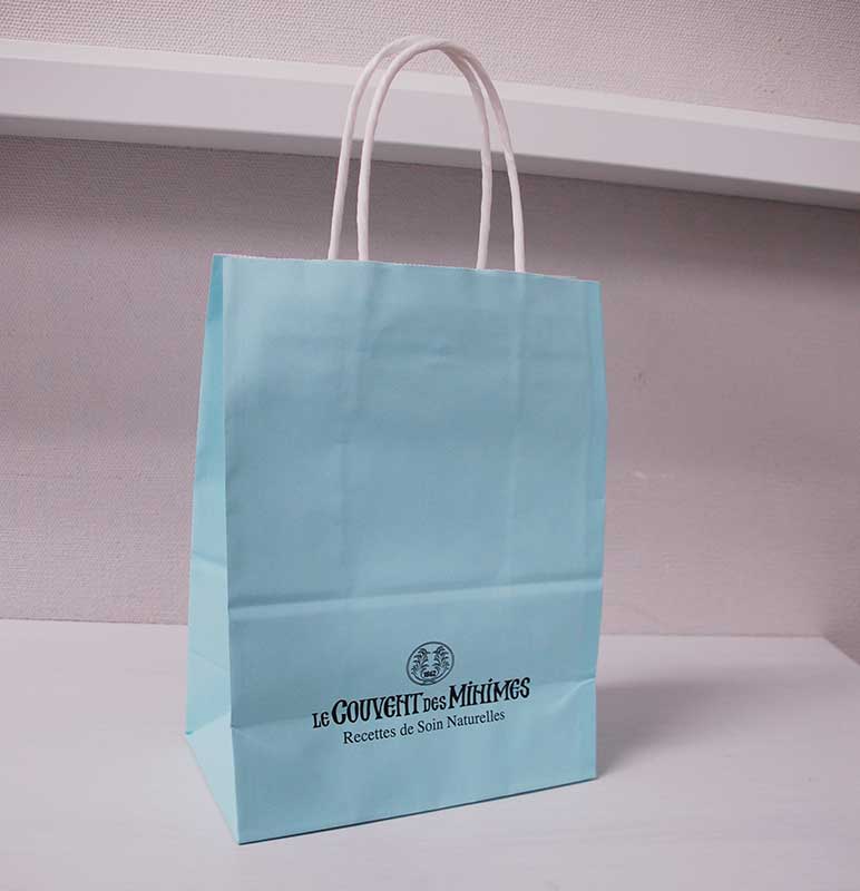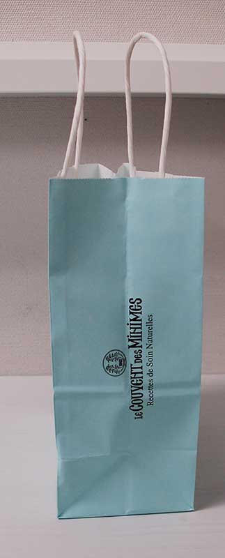 エメラルドグリーンの素敵な紙袋2013年02月16日 こんにちはベリービーの芦谷です。 みなさんバレンタインはいかがでしたか? 今日はスタッフのゆみちゃんが買ってきてくれた チョコレートの素敵な紙袋をご紹介します。 エメラルドグリーンにアンティークなデザインが素敵な紙袋です。 B面にはシンプルにロゴマークのプリント。 サイドにロゴなどを入れると、アンティーク感が増しますね。 紐は紙3本。万単位の製造が必要ですが、コストを押さえることができる仕様です。 コストとデザインのバランスを上手にとった紙袋ですね。