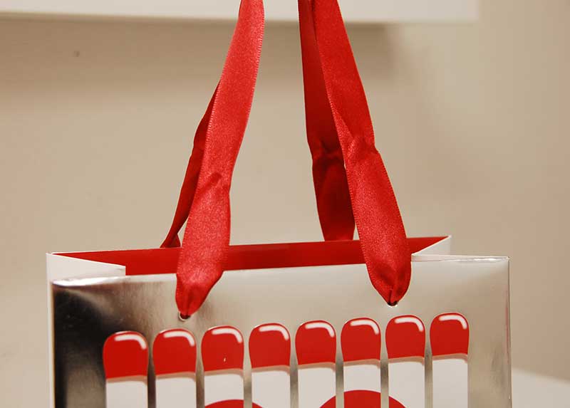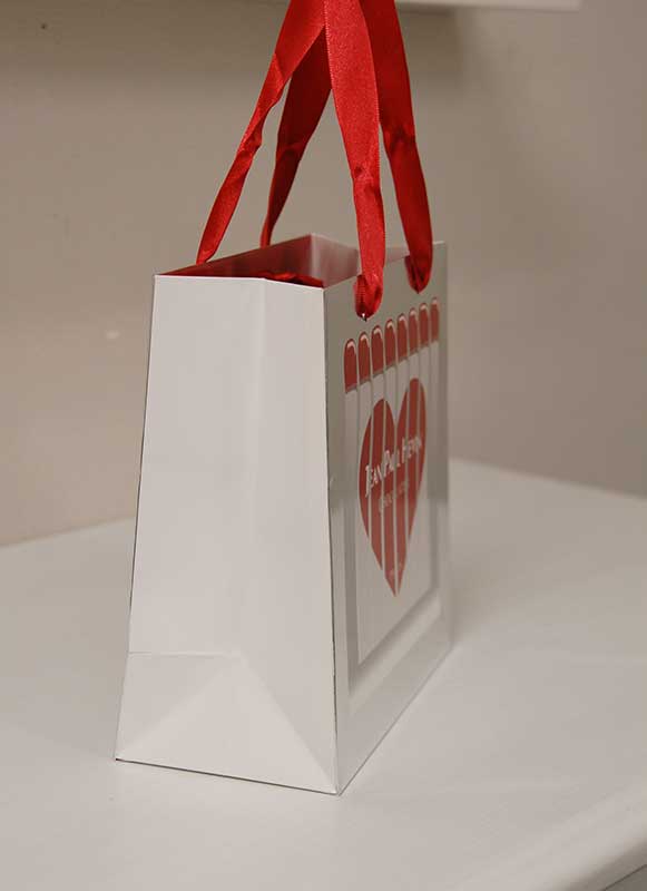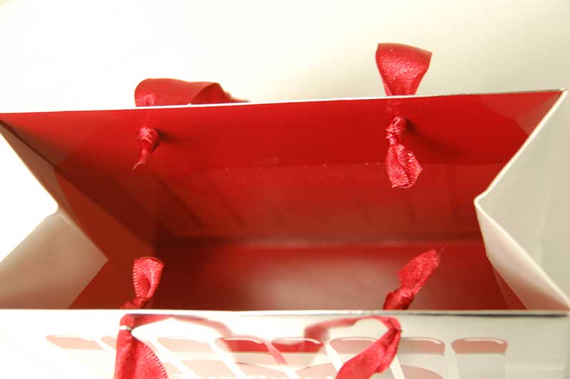 紙袋の世界はまだまだバレンタイン気分2013年02月22日 こんにちは!! 今日はバレンタインをかなり過ぎましたが、 素敵なバレンタインの紙袋をご紹介します。 かわいくマッチ棒をモティーフにした紙袋です。 サイドと底が白いところを見ると、 正面のシルバーは蒸着紙の色では無く、箔押しのようですね。 ハンドルはデザインに合わせて赤いサテンリボンを使用しています。 そして、内側には底ボールも含めて全面に情熱的な赤がプリントされています。 うーん、ハートに火を灯されそうな紙袋です。