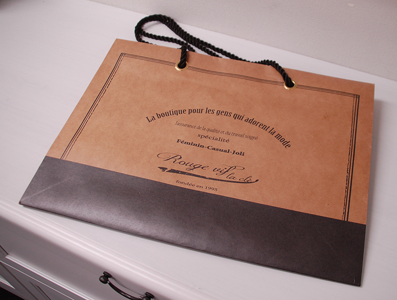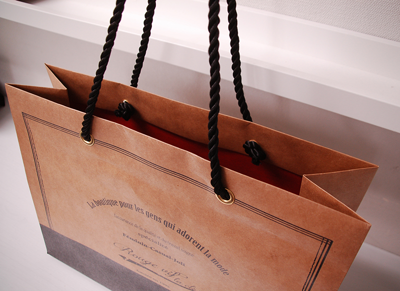 素材感が素敵なクラフトの紙袋2013年03月02日 こんにちはベリービーの芦谷です。 今日はクラフトの素材感を とても上品に使った紙袋をご紹介します。 少し、ワイルド感のあるクラフトにクラシカルなデザインがとてもマッチしています。 この紙袋に高級感を持たしているのは、 このツイストロープとハトメの存在です。 一般的にチープなイメージになりがちなクラフト紙ですが、 これらによって雰囲気が大きくかわっています。 なんと、内側には赤い印刷。 おしゃれーと唸らずにはいられないにくい仕様ですね!!