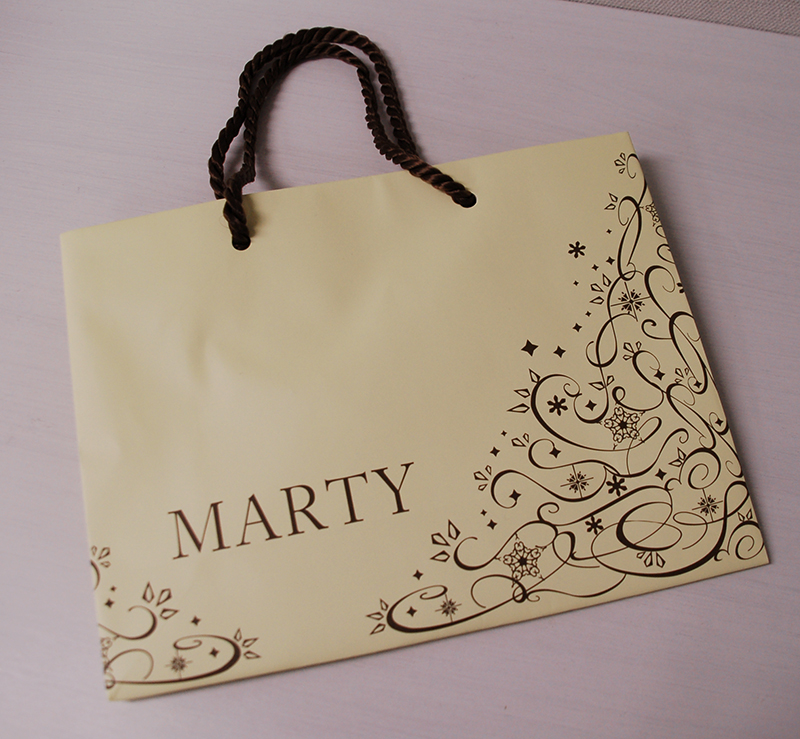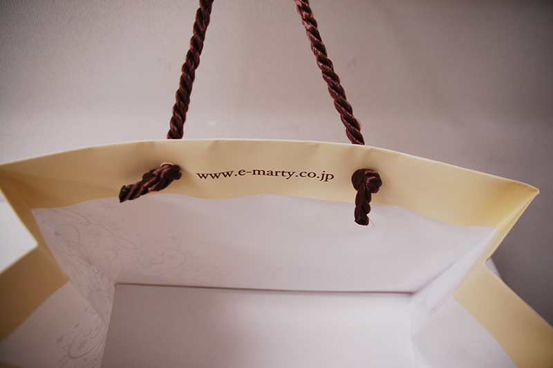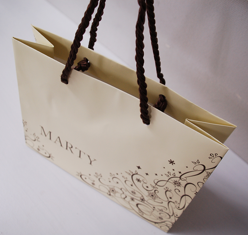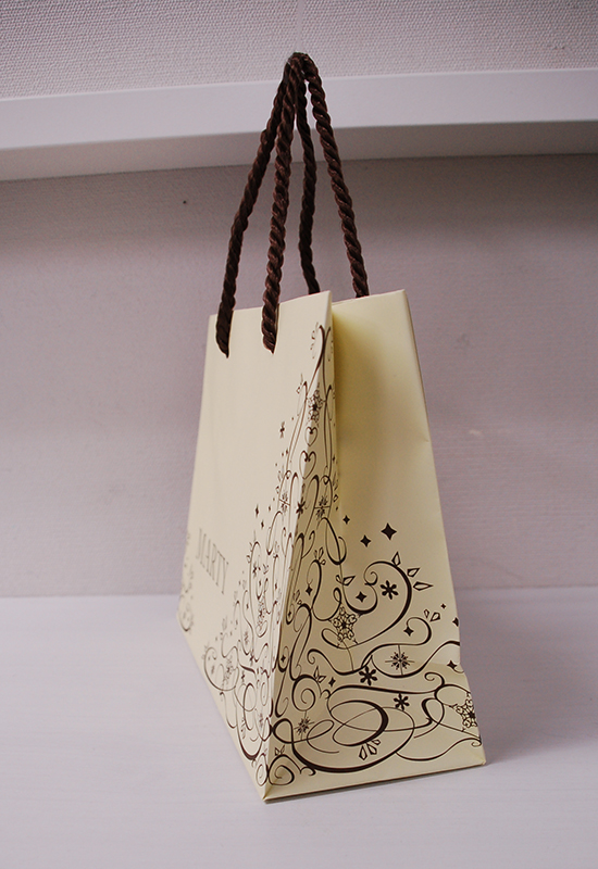 女性らしいツタ模様が素敵な紙袋2013年03月09日 こんにちは、本日はフェミニンなツタ模様が素敵な紙袋を ご紹介します。 女性に人気の高い、パステルイエローを基調に、 ブラウンのロゴマークとイラストが紙袋全面にデザインされています。 サイドにもデザインされています。 ハンドルは茶色のツイスト。 口折りにはおなじみのURLのプリントがあります。