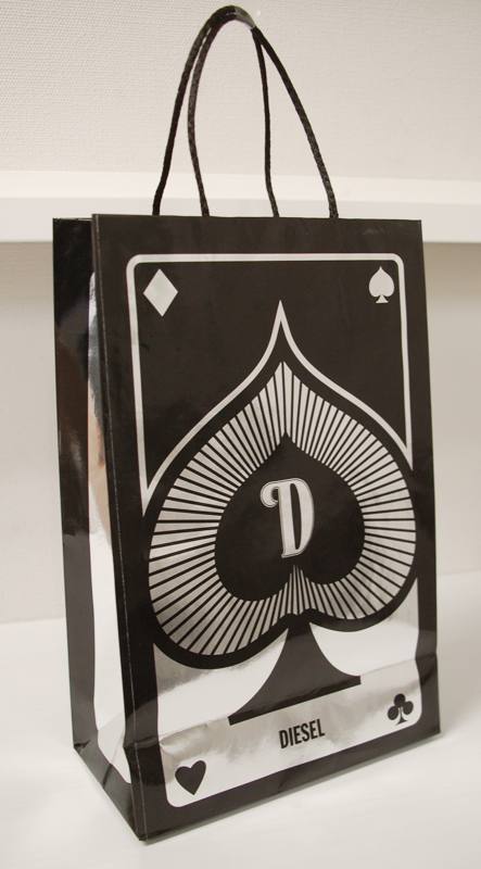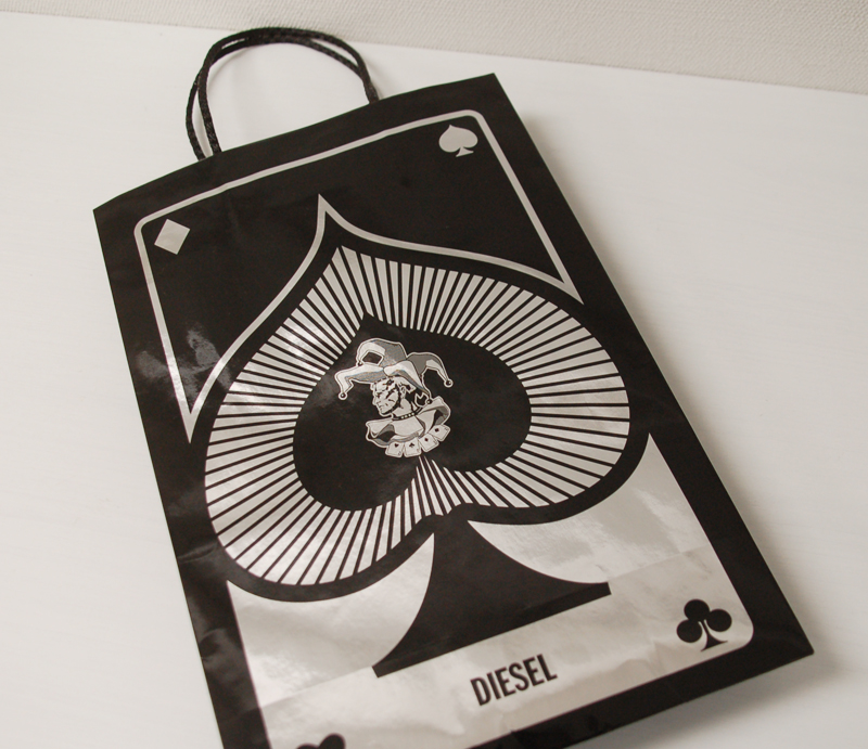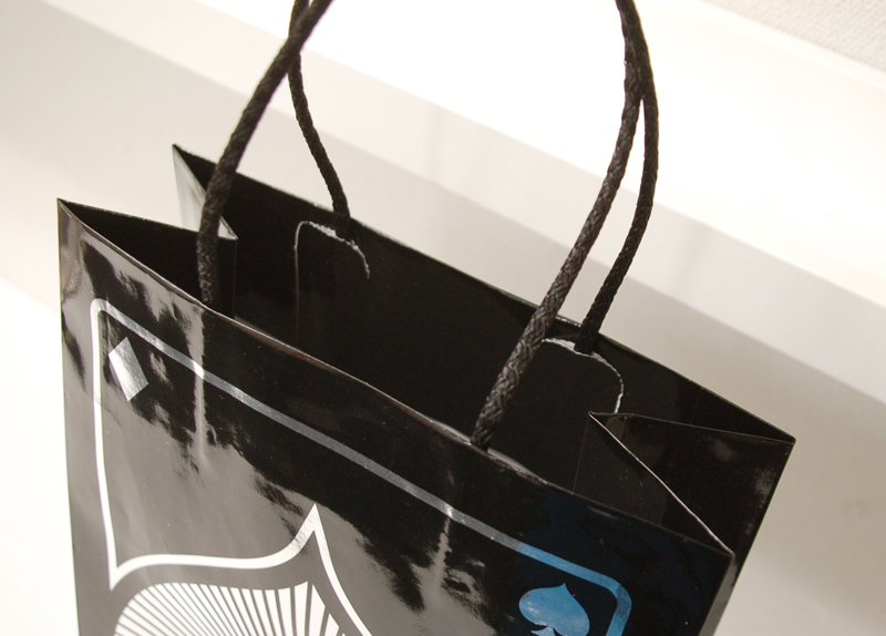 蒸着紙のかっこいい紙袋2013年03月15日 こんばんは、ベリービー辻です。 今日は蒸着紙のかっこいい紙袋をご紹介します。 細めのクールな紐が使われています。 蒸着紙に黒で印刷。 素材感とグラフィックがとてもマッチしていますね! B面はデザイン違い。 側面。 商品を入れる袋とリボンも素敵です。