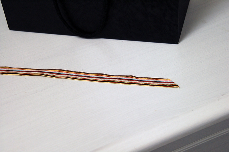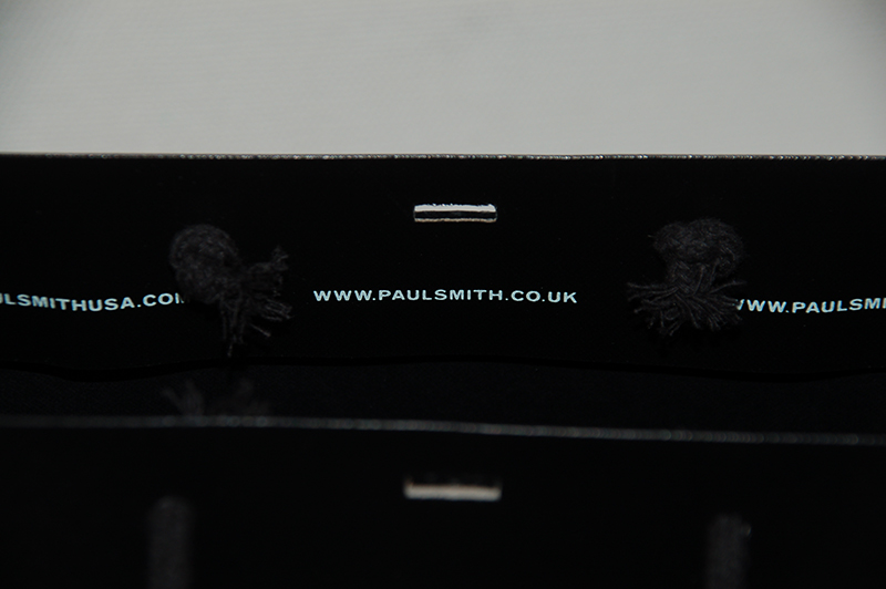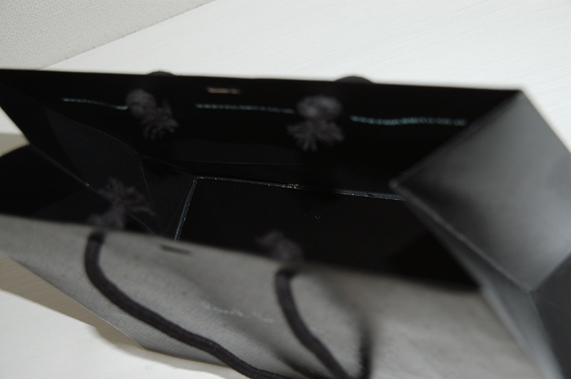 ロンドンのエスプリを感じさせるオシャレな紙袋2013年04月06日 こんにちはベリービーの芦谷です。 今日はロンドンを感じさせるオシャレな紙袋をご紹介します。 深いブラックにシンプルな箔押しロゴが大人っぽくていいですね。 紙袋の表面にはレザー感のあるエンボスがほどこされています。 このブランドの象徴であるカラーパターンになったリボンが ブラックとのコントラストを素敵に演出しています。 口折りに入っているURLもパターンのように使うことでとても格好良く感じますね。 内側は底ボールも含めて黒に統一されています。