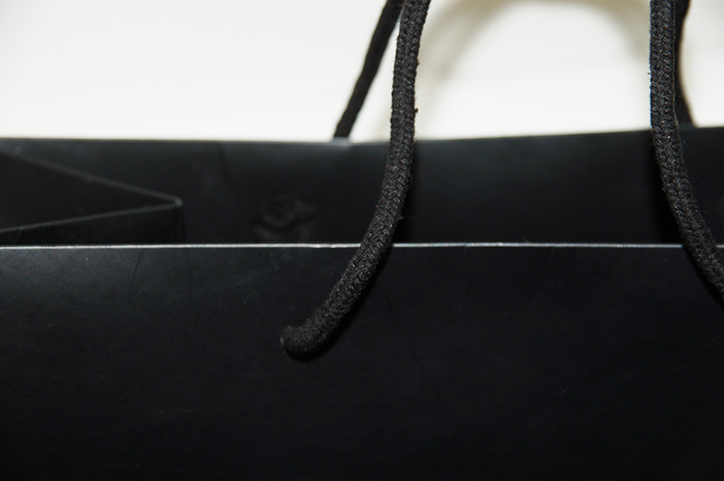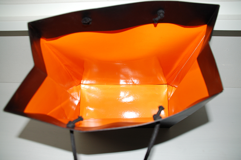 ハードに真っ黒!!な紙袋2013年04月13日 こんにちはベリービーの芦谷です。 今日はとっても男らしく、ハードな紙袋をご紹介します。 とってもシンプルに黒字にUV印刷のロゴのみという男らしさです。 紙質もとってもハードで200g以上のコート紙を使っています。 浮き出しも箔押しも無く、シンプルです。 紐もシンプルな黒のアクリルスピンドル。 そのシンプルさを裏切るように… 中は燃えるような「オレンジ」にグロスPP貼りでピカピカ!! ブランドカラーでしょうか?
