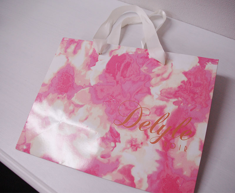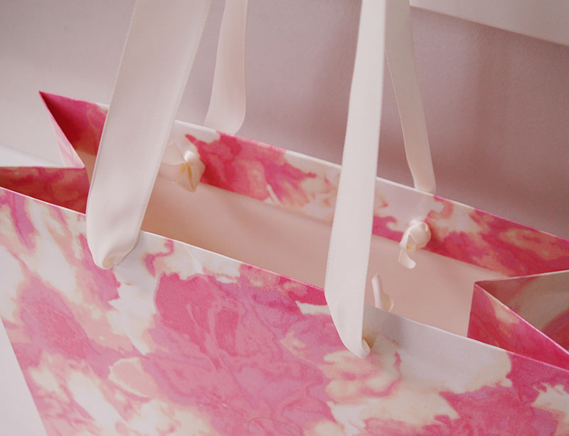 エレガントな紙袋2013年04月17日 こんにちは、ベリービー辻です。 今日はエレガント感 たっぷりの紙袋をご紹介します。 ハンドルは清楚な白サテンリボン。 紙袋の表面はグロスPP加工です。 ロゴ部分には浮き出しエンボスがかけられています。 仕様はシンプルな紙袋ですが グラフィックとサテンリボンがマッチしていて バラの香りでもしそうなエレガントな紙袋ですね。