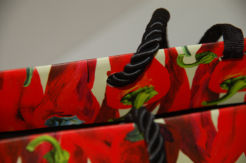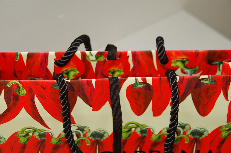 スパイスの効いた素敵なデザインの紙袋2013年05月13日 こんにちはベリービーの芦谷です。 今日も私のお気に入り紙袋をご紹介します。 唐辛子のイラストがずらりと並んだ素敵なデザインです。 ロゴマークは浮き出し黒です。 インパクトのあるデザインにロゴマークが埋もれないよう工夫されています。 ツイストロープのハンドルはリボンと同様縦留めされています。 内面の黒一色が紙袋の高級感を高めていますね!!