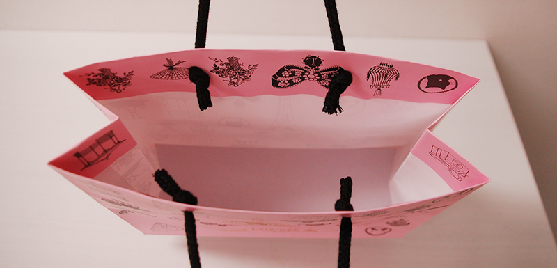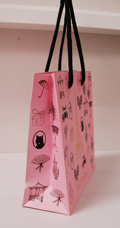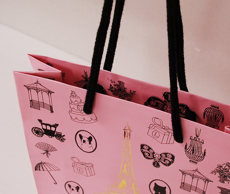 フレンチテイストの素敵な紙袋2013年05月14日 こんばんは、ベリービー辻です。 今日はフレンチなステキな紙袋を ご紹介します。 紐はアクリルスピンドルです。 紙袋の口折り部分にもかわいいアイテムがいっぱい! 紙袋の側面にも。 エッフェル塔とロゴ部分は箔押しです。 かわいいアイテムが散りばめられて もらうと嬉しくなる紙袋ですね!!