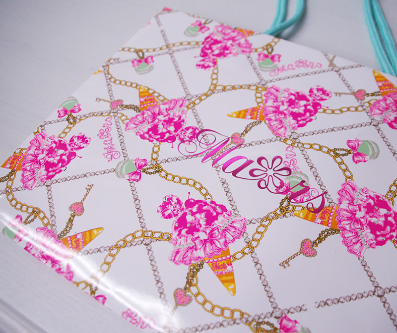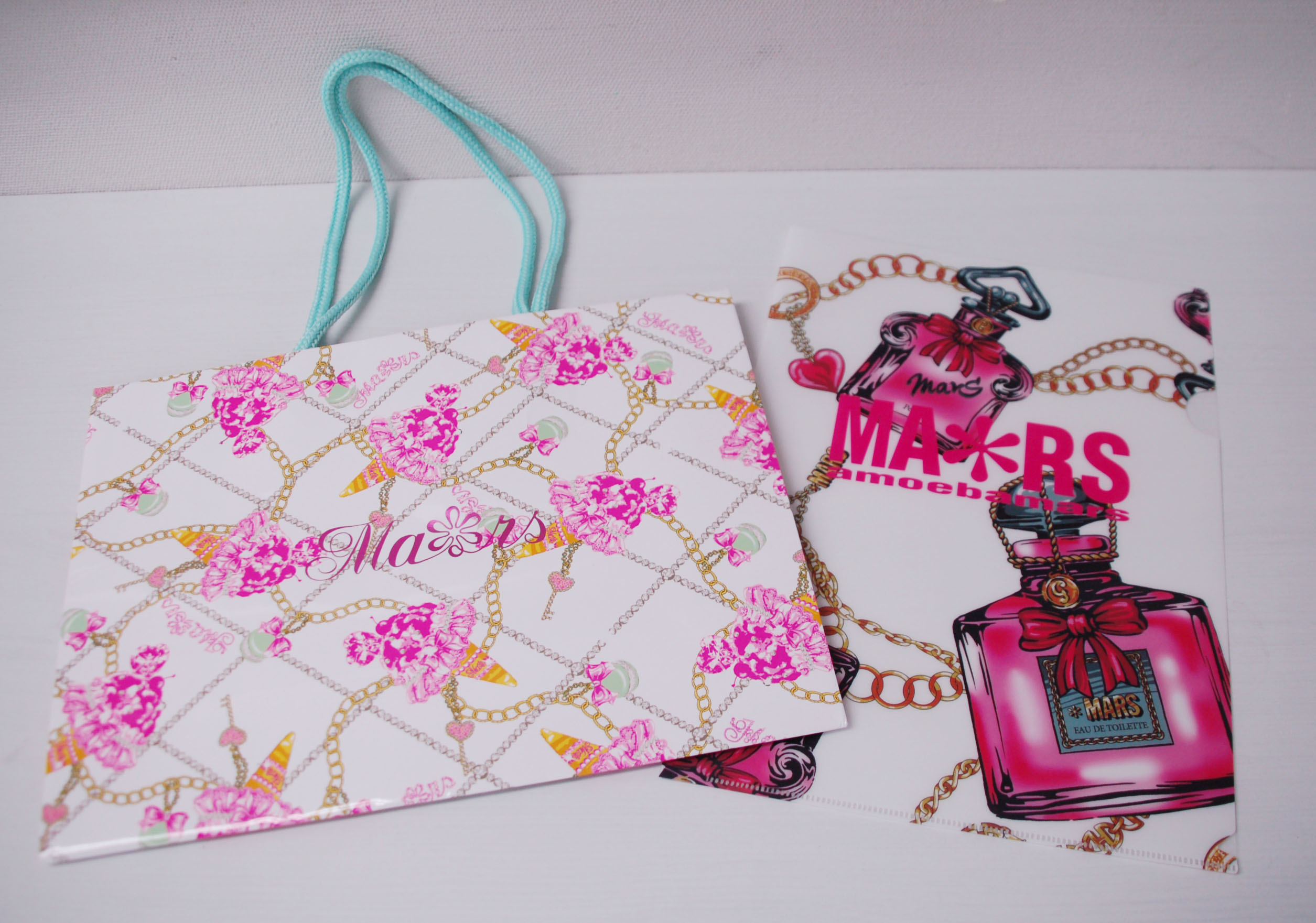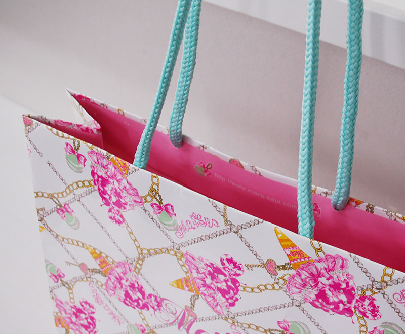 ゴージャスなグラフィックの紙袋2013年05月29日 こんにちは、ベリービー辻です。 今日はグラフィックがゴージャスな紙袋を 御紹介します。 紐はアクリルスピンドル。 補色関係のカラーリングがかわいいですね。 紙袋の内側はピンクを全面に印刷されてキュートさUP!! 紙袋本体は光沢のあるPP加工がされています。 ロゴはピンクの箔押し。 ノベルティのクリアファイルもゴージャスなデザインです! 紙袋の仕様はシンプルですが 主張のある、素敵な紙袋ですね!!