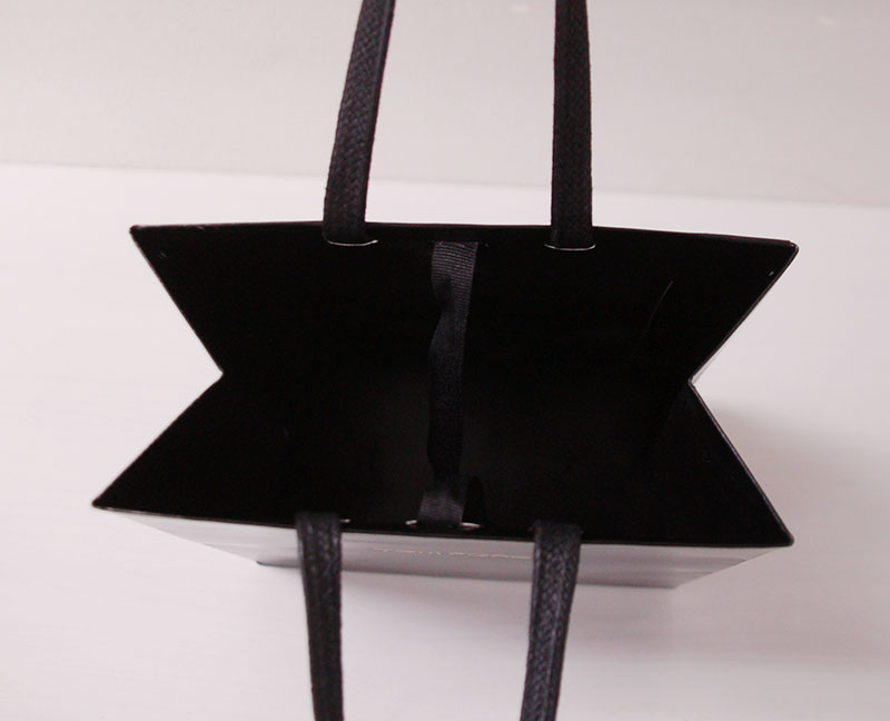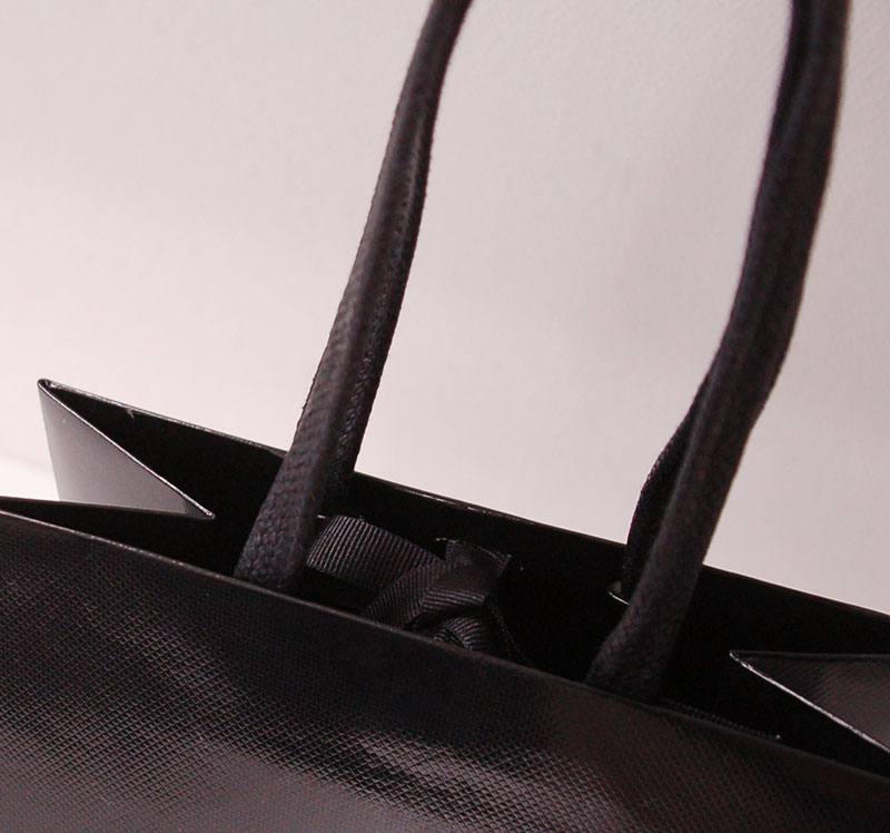 高級感漂うエンボス紙袋2013年05月31日 こんにちは、ベリービー辻です。 今日は高級感のある紙袋を御紹介します。 紐はワックスコードです。 口留め部分はグログランテープが使用されています。 紙袋の内側も黒一色!! 紙袋の表面はエンボスが施され、高級感があります。 ロゴ部分はゴールドの箔押し。 紙袋表面にエンボスをかけると高級感がぐっとアップしますね!!