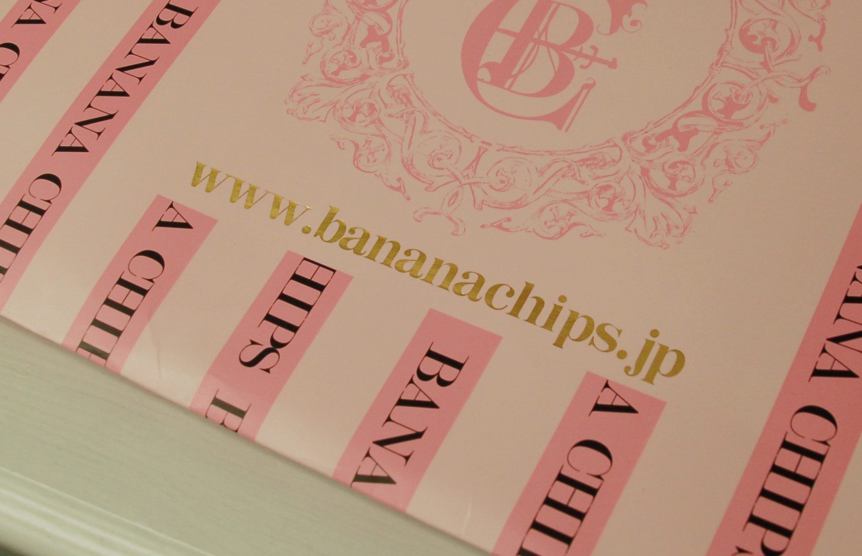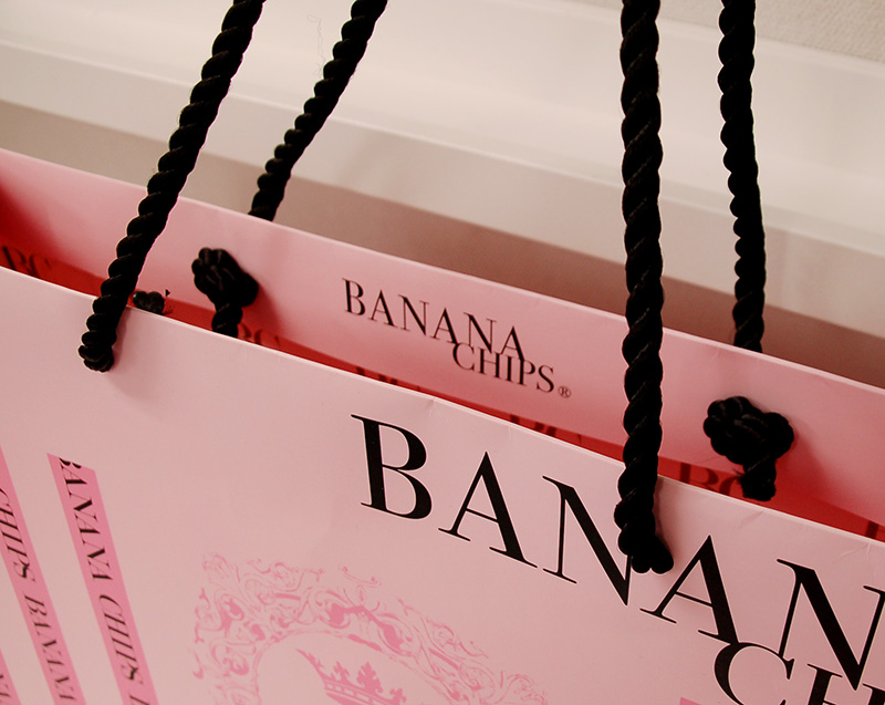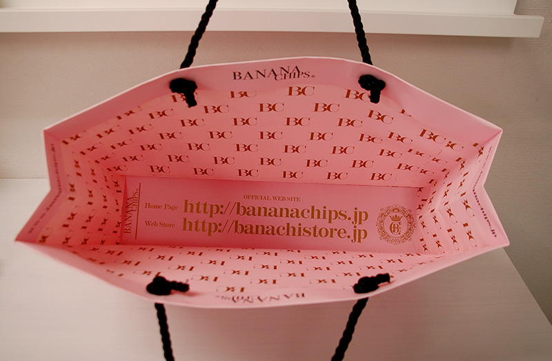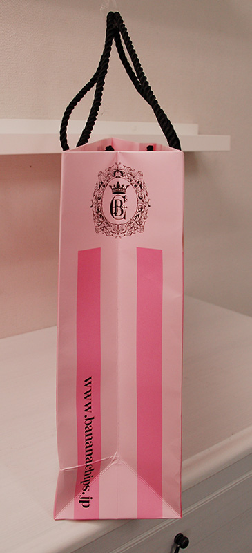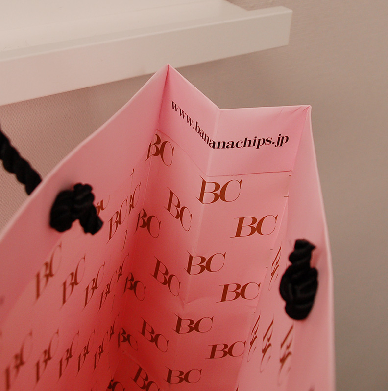 ストロベリーチョコレートのような紙袋part22013年06月07日 こんにちは、ベリービー辻です。 昨日に引き続き、今日も素敵な紙袋をご紹介します。 側面にもグルッとデザインされています。 紐はツイストロープ。 ツイストロープをつけると、キリっとした印象になりますね。 側面の口折部分にはURLが印刷されています。 内側にもロゴがプリントされています。 マットな紙質に金の箔押し。