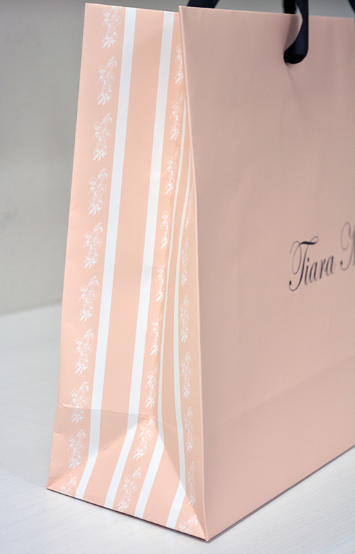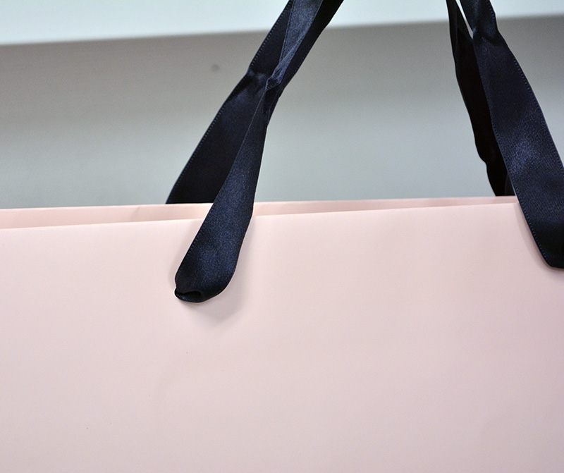 「ヌードピンク」と大流行の「サテンリボン」を使用した紙袋です。