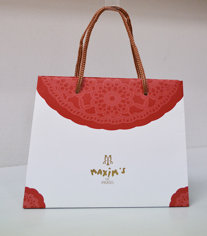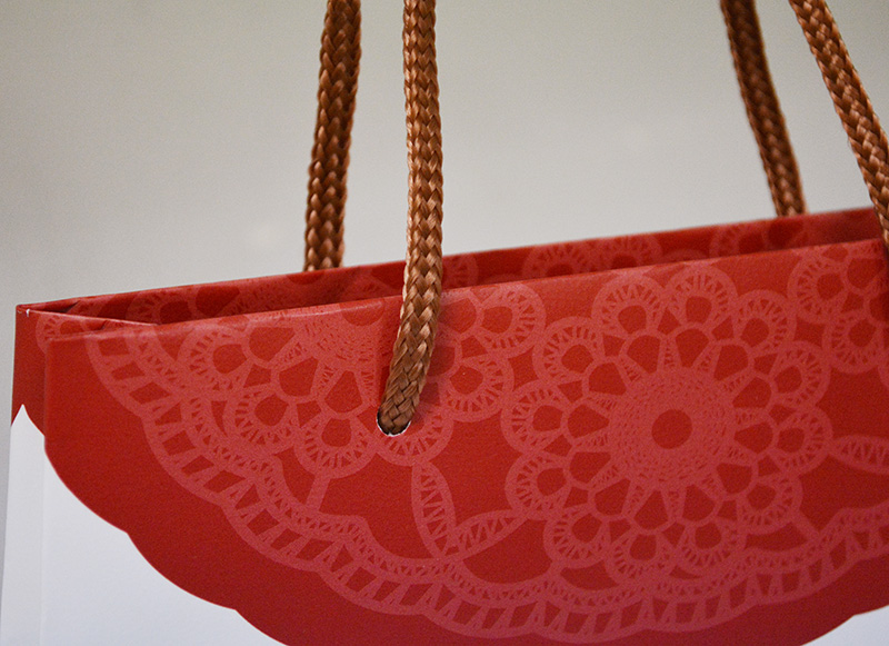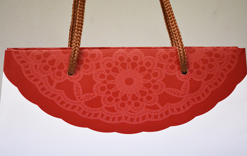 ハンドバックをモチーフにしたかわいい紙袋2013年08月05日 こんにちはベリービーの芦谷です。 今日はハンドバッグをモチーフにしたかわいい紙袋をご紹介します。 台形に作られた紙袋です。 正面から見るとよく分かりますね。 ロゴマークは箔押しで存在感を高めています。 フロント部分のレース柄プリントがかわいいですね。 紐はブラウンのパイレン紐を使用しています。 手のひらにのるようなサイズの小さな紙袋。 デザインとのバランスがよくあっていますね。