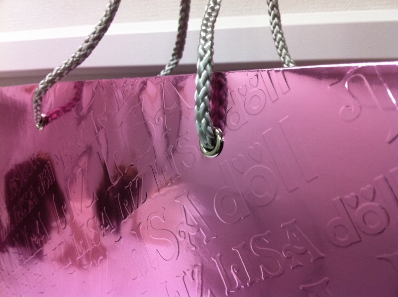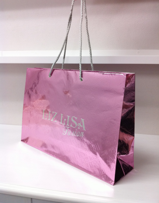 人気のギャル系ブランドのオリジナルショップ袋のデザイン2011年06月22日 こんにちはベリービーの芦谷です。 今日は人気の“ギャル系”ブランドのオリジナル紙袋をご紹介します。 紙袋の表面は眩いばかりのキラキラピンク!! そして、紙袋全面にロゴマークがエンボスされているという迫力です。 ロゴは浮きだしで箔押しじゃなく紙袋の原紙としてして使われている 蒸着紙のシルバー色を生かしているようです。 手提げもピカピカのスピンドルが使われています。 そして、シルバーのハトメがとっても紙袋にマッチしています。 抜群の存在感を光沢で醸し出しているオリジナル紙袋ですね。
