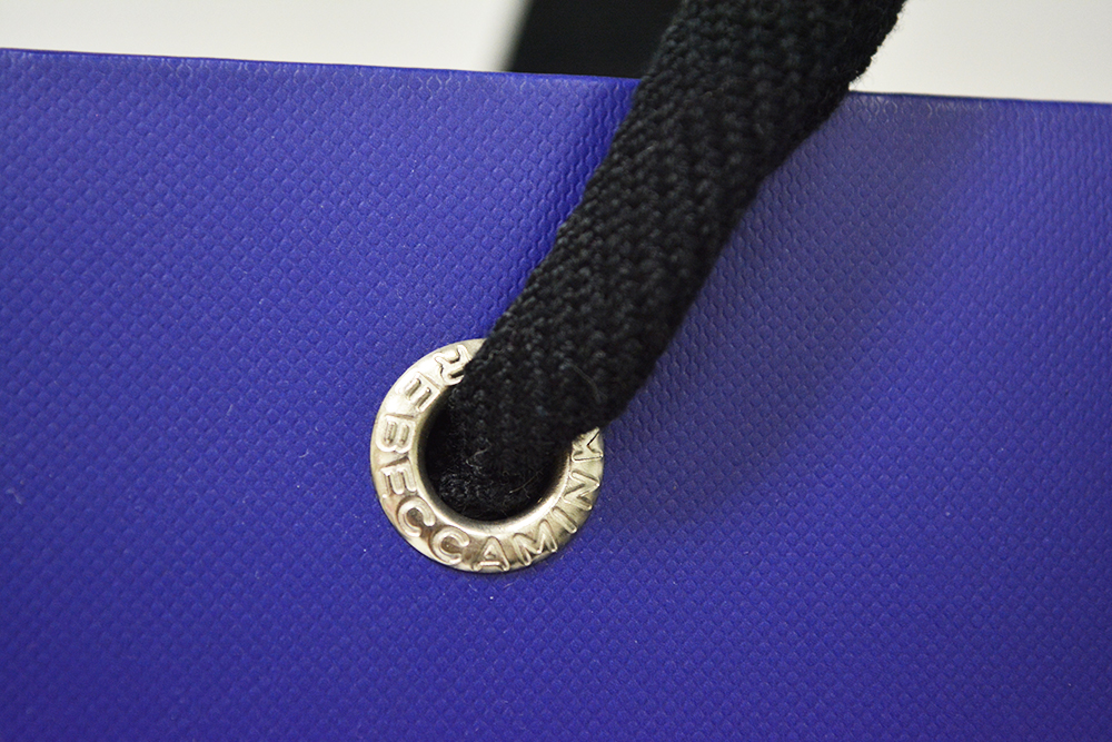 オリジナルのハトメを使った紙袋2013年10月07日 こんにちは! ベリービーの加茂です この紙袋は革製品を扱うファッションブランドの紙袋ですが、 サイズが大きめなのでバッグ用でしょうか? 全面を紺色に印刷し、ロゴを白ヌキにしたシンプルなデザインです。 紙はハイブランドなんかにも使用される厚めの紙で、 ジャガードエンボスが施されています。 厚めの紙ということもあって重量感がありますね。 紐はアクリル平紐を使用しています。 そして大きなハトメにはブランド名が入っています。 女性向けのブランドとは思えない程にたくましい紙袋です!