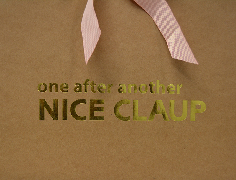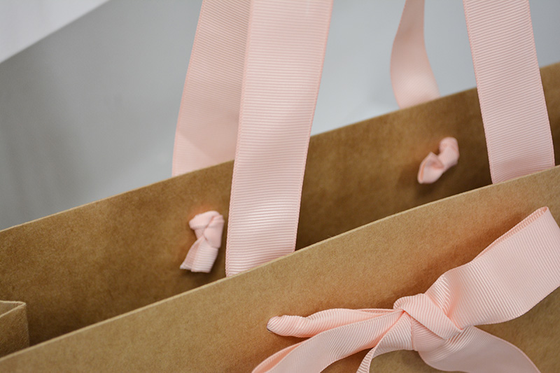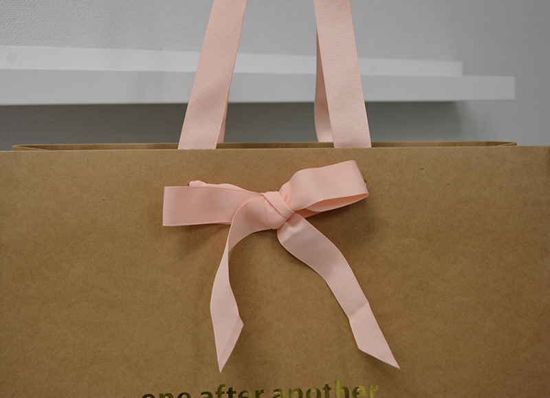 やっぱりグログランテープの紙袋に人気集中!!2013年10月17日 こんにちはベリービーの芦谷です。 今日ご紹介する紙袋も ハンドルにグログランテープを使用した物です。 フェミニンなイメージを強調するように グログランを蝶々結びで使用しています。 紙袋の素材そのものは 海外製のざらっとしたクラフト紙を使っているので ナチュラル感たっぷりです。 しかし、ロゴにゴールド箔押しを使用することで、 高級感もしっかり表現しています。 近頃、女性を中心に圧倒的な人気を誇るグログランテープ。 皆様もぜひ、お試し下さい!!