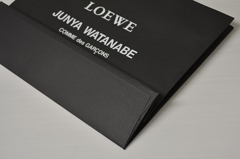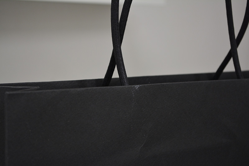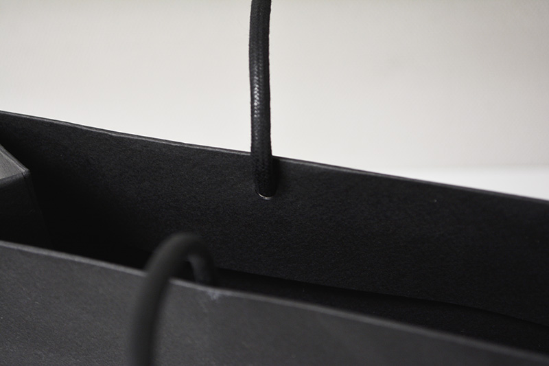 シャープで高いデザイン性を感じさせる紙袋2013年10月28日 こんにちはベリービーの芦谷です。 今日は「さすがーーーー」と思わせるシャープなデザインの紙袋をご紹介します。 本体、ハンドルを深いブラックで統一。 漆黒の中に浮き出すような白(おそらくシルクスクリーン)でロゴプリント。 用紙にはタントのようなナチュラルな紙を使用。 高級感のあるワックスコードをシンプルに縦留めで取り付けています。 ヨーロッパ仕様の底。 なかなか加工の出来る工場を探すのが難しいですが、 シンプルな仕上がりが美しい仕様ですね!