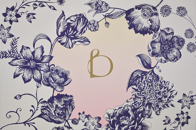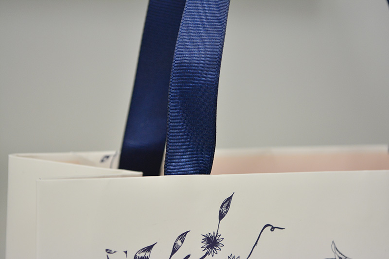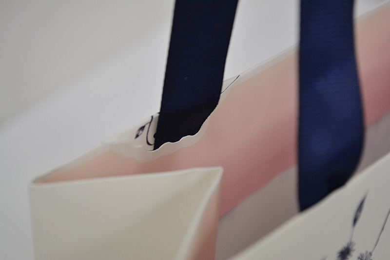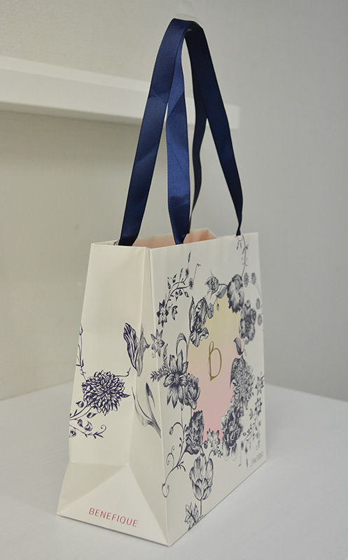大人の淑女を思わせる紙袋2013年10月31日 こんにちはベリービーの芦谷です。 今日は大人の女性の魅力を感じさせる、 上品な紙袋をご紹介します。 クリーム色をベースに深い紺色とピンクの補色対比が 美しいバランスを作っています。 サイドにも絵柄を巻き込ませたデザインです。 ハンドルには細めのグログランテープを使用しています。 このリボン幅が大人を感じさせるのでしょうか? リボンは縦留めで取り付けられていますが 表の花柄を生かすために わざわざ型抜きして花柄を生かしているところは、 流石のこだわりようですね!!