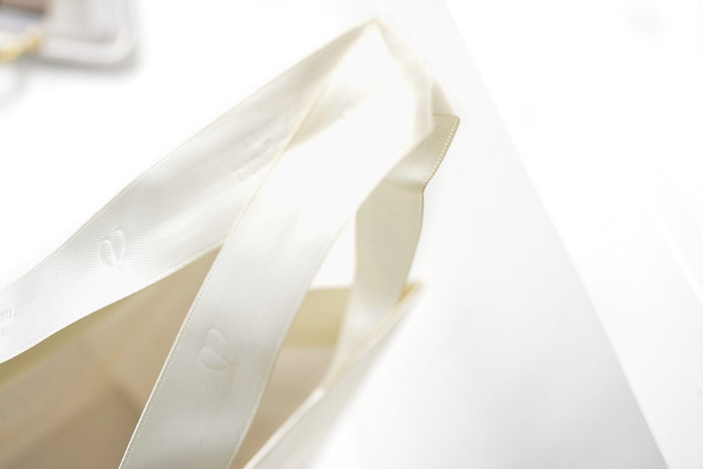 細部に高級感溢れる紙袋2013年11月13日 こんにちは、ベリービーの高橋です。 今日は、上品で高級感溢れる紙袋をご紹介します。 金箔の浮き出しロゴに加え、写真では見えにくいですが パール地の紙に白色の印刷が施されています。 ですので、全面に真珠のような鈍い光沢があり 高級感があります。 その上、持ち手のサテンリボンにも空押しのスタンプでロゴが印字されています。 そしてハンドルは縦止めです。 細部にまでこだわりが見られ 女性への気配りにこだわってモノ作りをしているブランドの 紙袋一つとってもこだわりが違いますね。