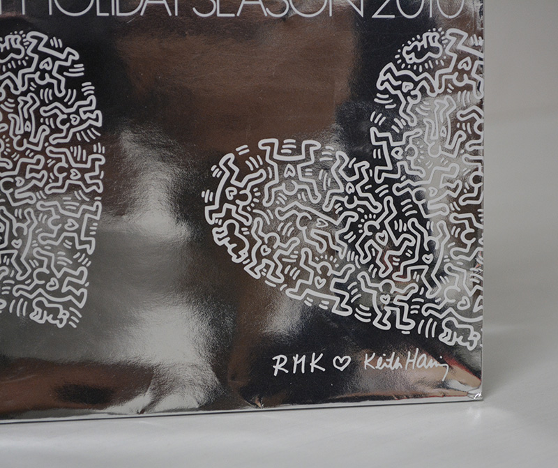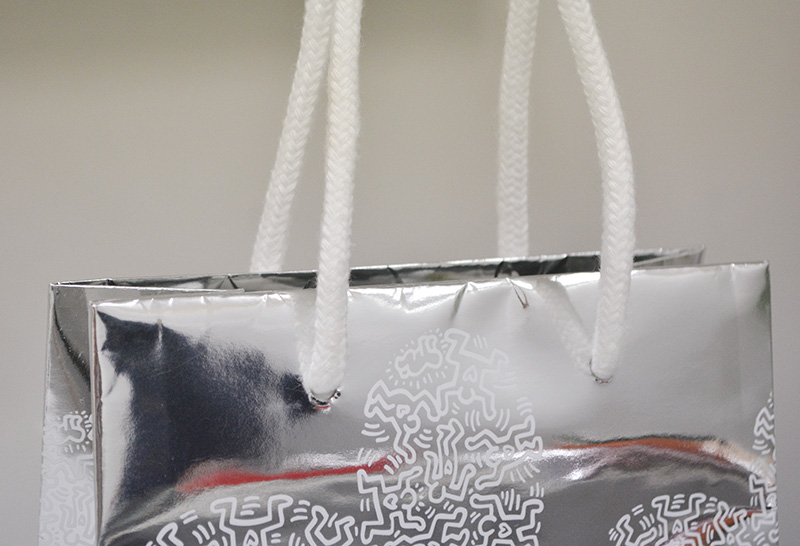 もうすぐクリスマスって感じの紙袋2013年11月16日 こんにちはベリービーの芦谷です。 もうすぐクリスマスシーズンです。 紙袋業界ではほとんど準備終了、来年のヴァレンタインに向けた準備中!! といった感じですが、 今日は少し前のクリスマス紙袋をご紹介します。 シルバー蒸着紙にUVホワイトインクで印刷した仕様です。 あのニューヨークの有名アーティスト、キースへリングとのコラボレーションです!! ハンドルにはホワイトクリスマスを感じさせるシンプルなスピンドルを使用しています。
