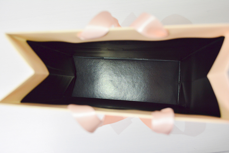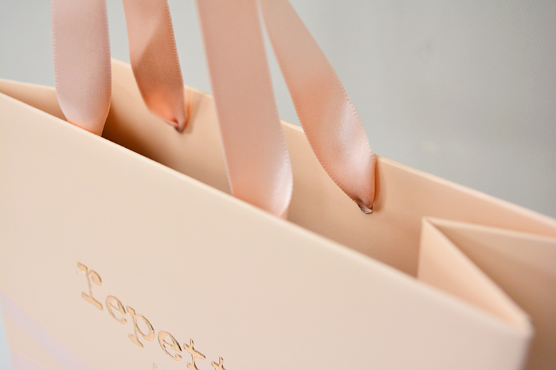 内面にはブラックベタが印刷され、 可愛さだけで無い、大人っぽさも演出された、とても完成度の高い紙袋です。